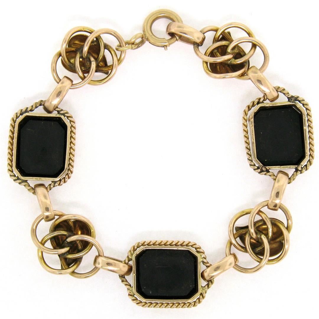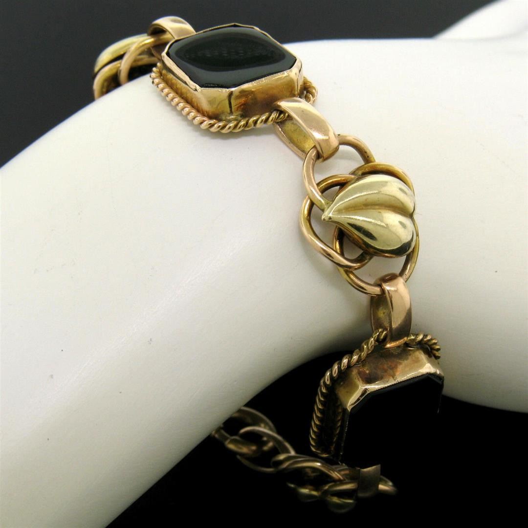 A great condition vintage 14k gold bracelet with green gold leaves on interlocked rose gold rings and three rectangular black onyx measuring approximately 13.7x11.7mm. It weighs a total of 21.59 grams, measures 15.1mm wide, and will fit up to a 7 inch wrist.