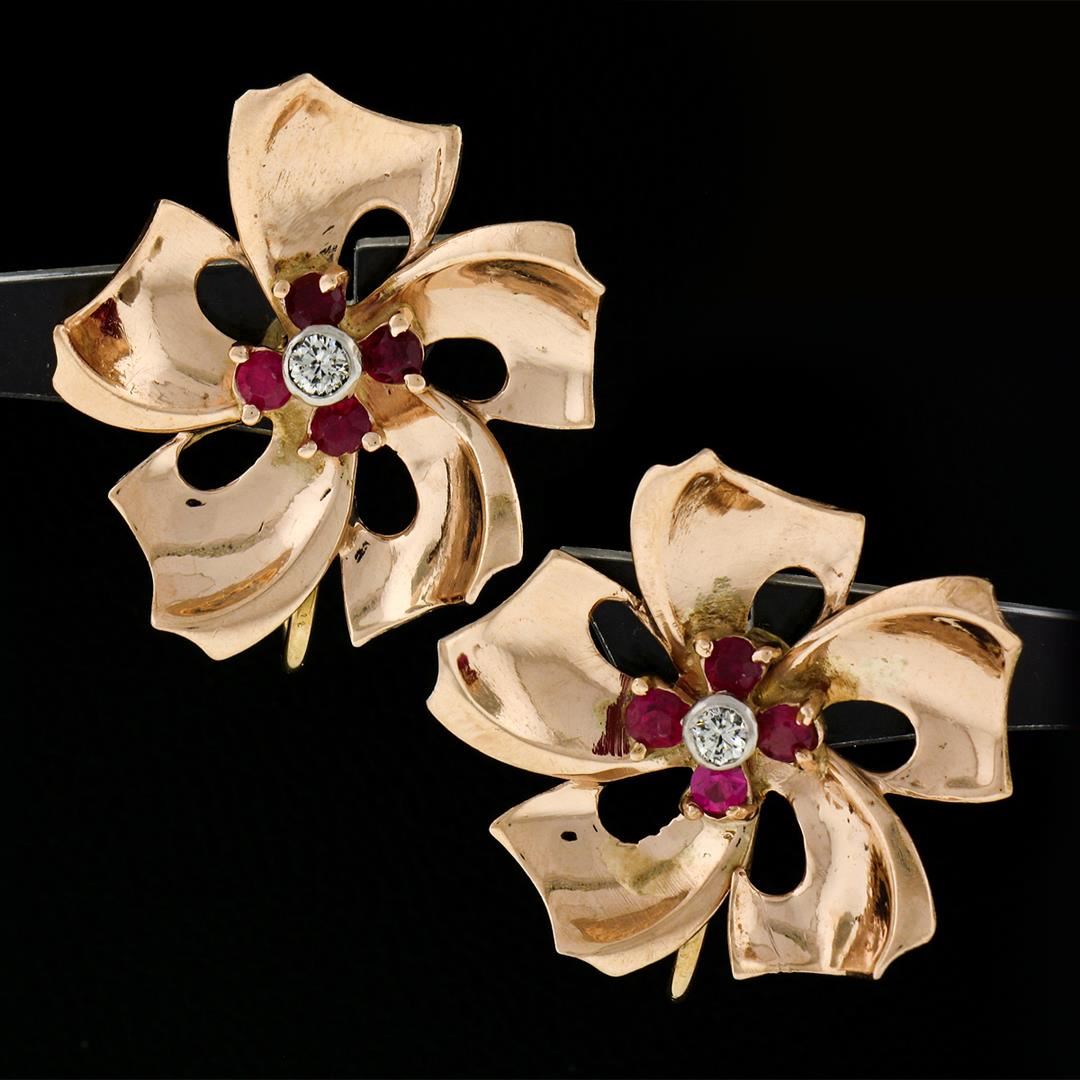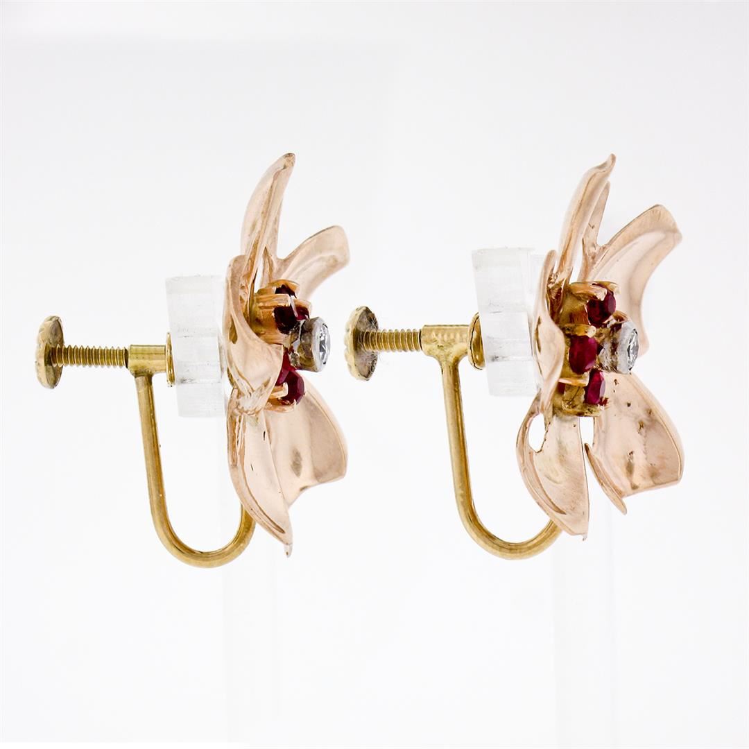A vintage solid 14k rose gold earrings, with 8 old round cut natural rubies (0.80ctw), and 2 transitional cut natural diamonds (G/H - VS2 ; 0.12ctw). The earrings measure approximately 26.25x25.70mm and weigh a total of 8.37 grams.