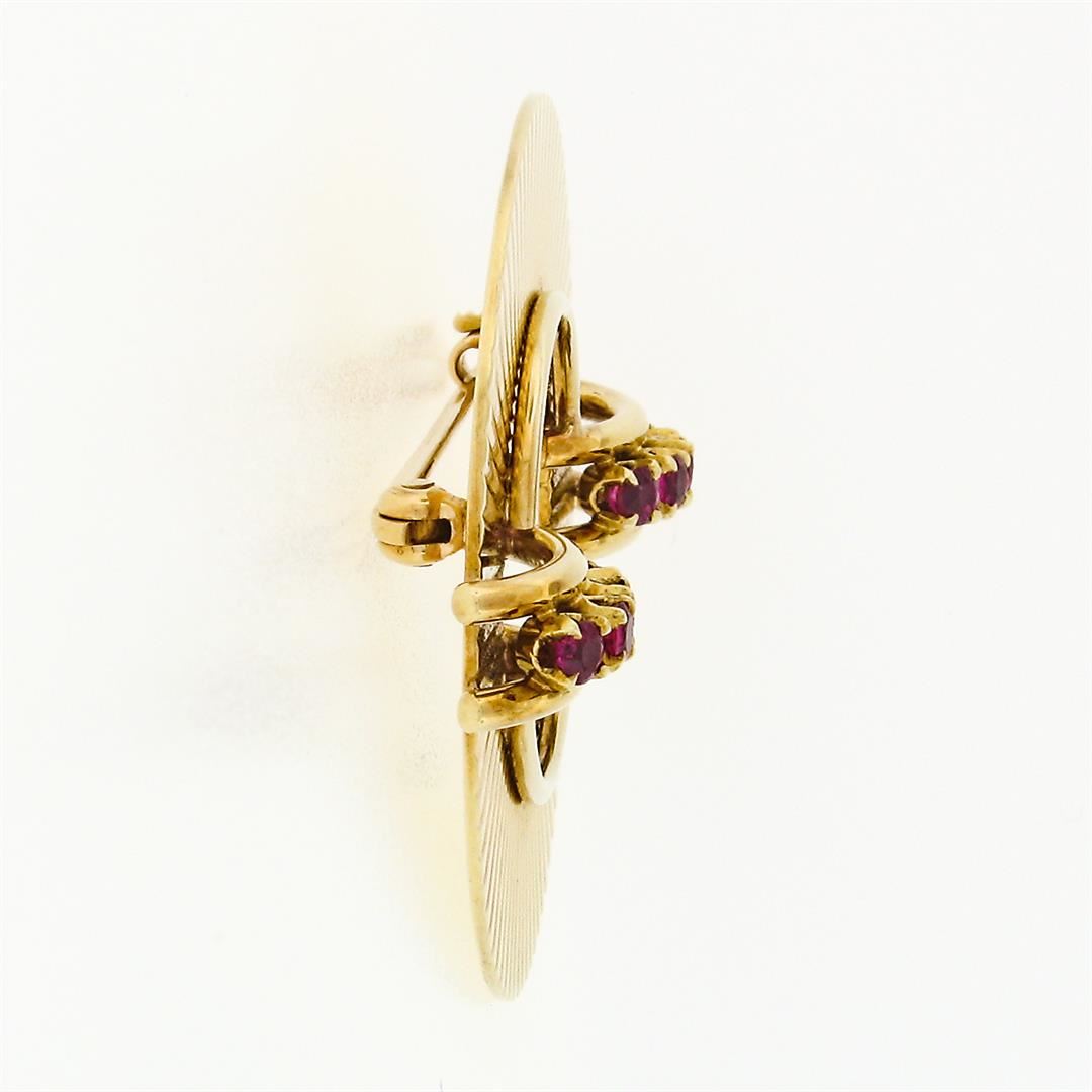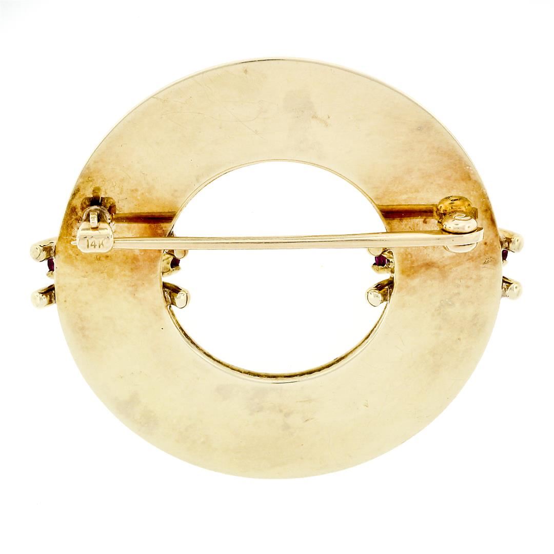 A vintage 14k yellow gold wreath brooch, with 8 round brilliant cut natural rubies (0.64ctw). Measures 38.82x42.67mm and weighs a total of 13.16 grams.