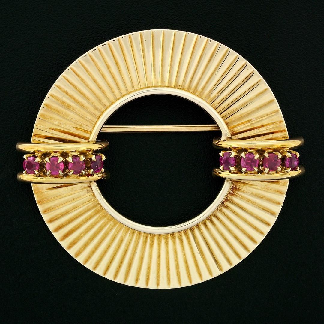A vintage 14k yellow gold wreath brooch, with 8 round brilliant cut natural rubies (0.64ctw). Measures 38.82x42.67mm and weighs a total of 13.16 grams.