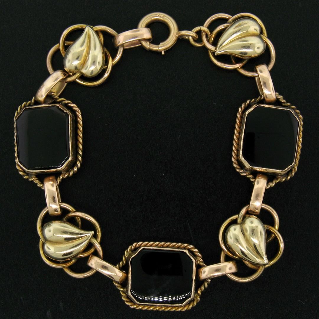 A great condition vintage 14kt gold bracelet with green gold leaves on interlocked rose gold rings and three rectangular black onyx measuring approximately 13.7x11.7mm. It weighs a total of 21.59 grams, measures 15.1mm wide, and will fit up to a 7 inch wrist.
