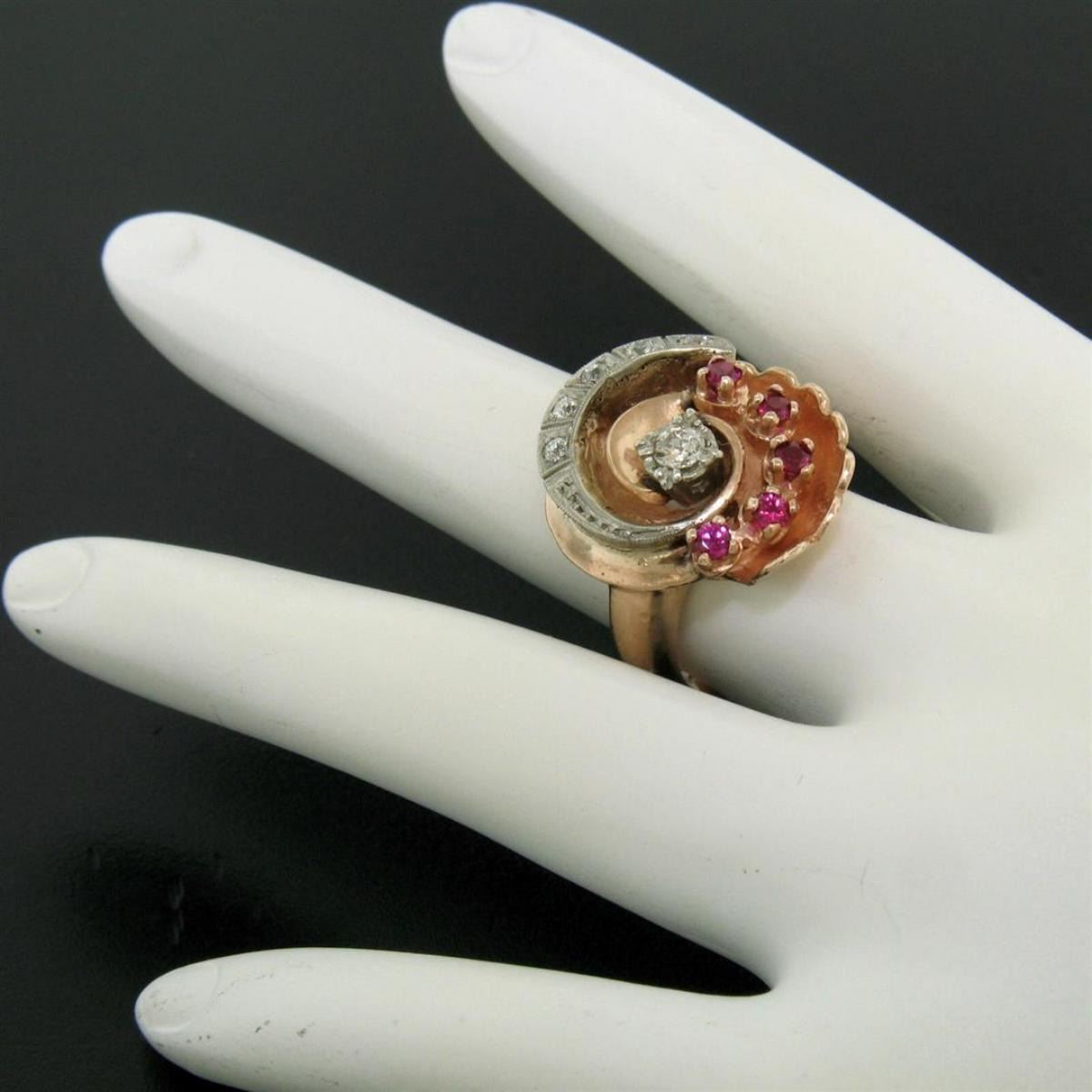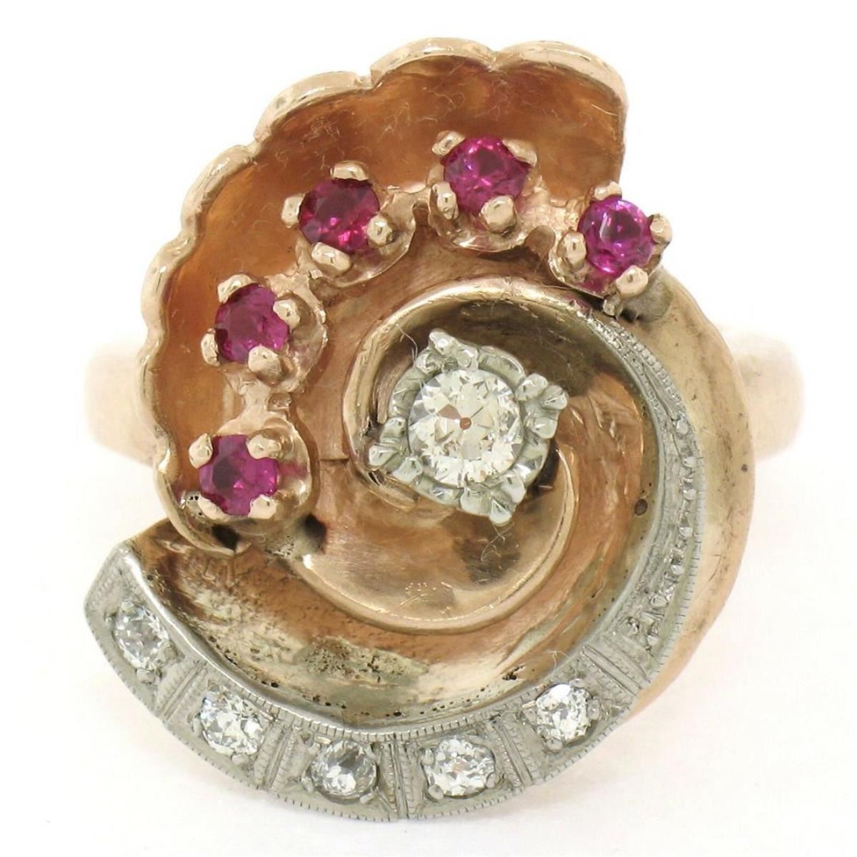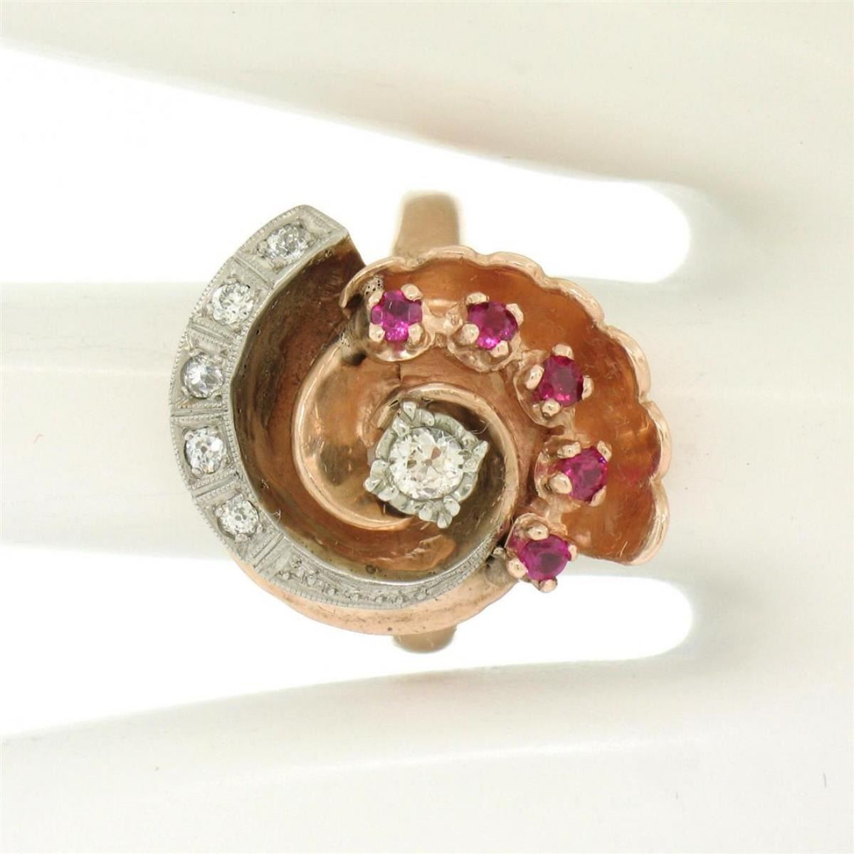 A vintage 14kt rose gold and .900 platinum ring with 0.30ctw of European cut diamonds (G to I - VS2/SI1) and 0.35ctw of round rubies set in a swirl pattern.The ring is size 5.5, weighs a total of 11.13 grams, and measures 22.30mm wide.