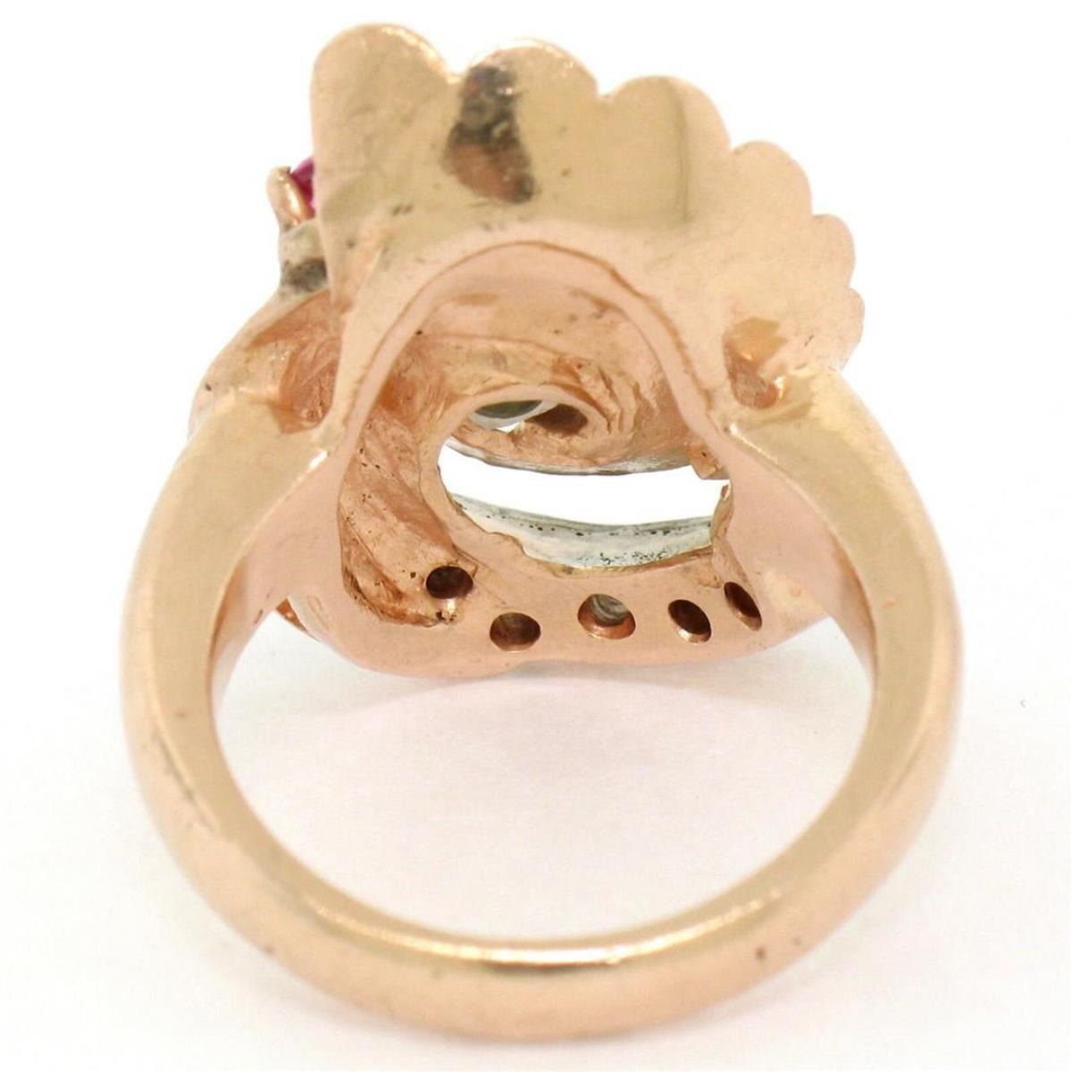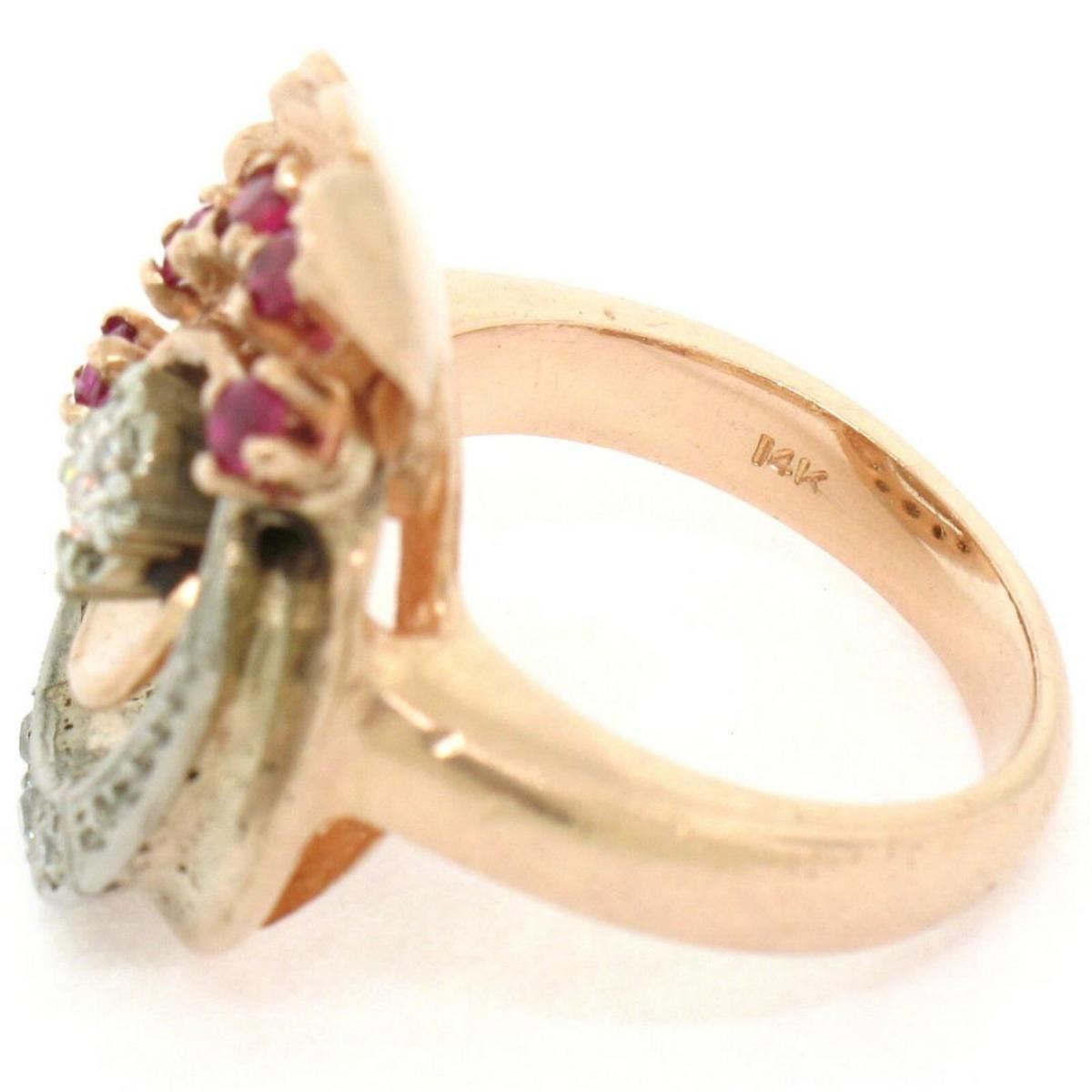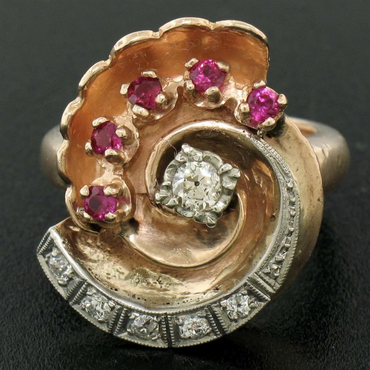 A vintage 14kt rose gold and .900 platinum ring with 0.30ctw of European cut diamonds (G to I - VS2/SI1) and 0.35ctw of round rubies set in a swirl pattern.The ring is size 5.5, weighs a total of 11.13 grams, and measures 22.30mm wide.