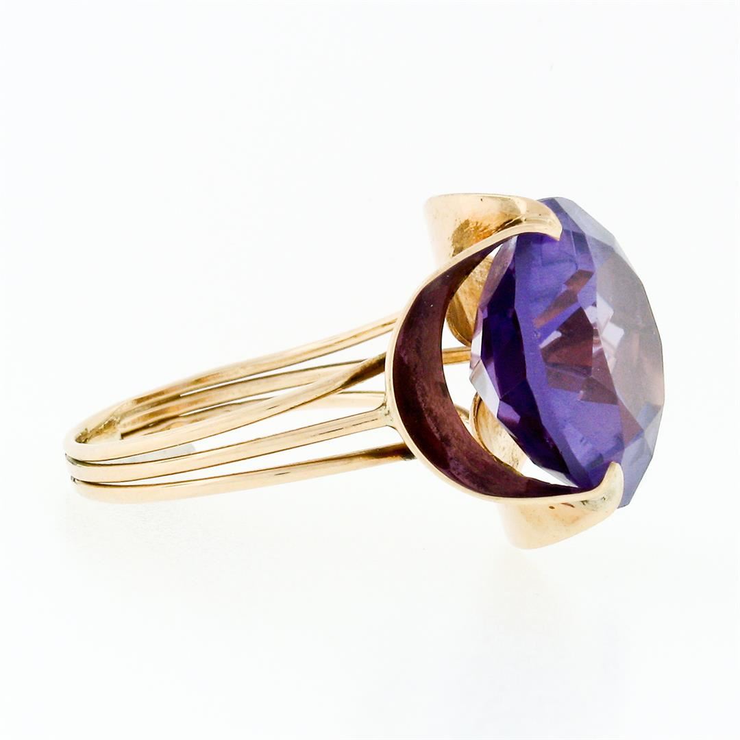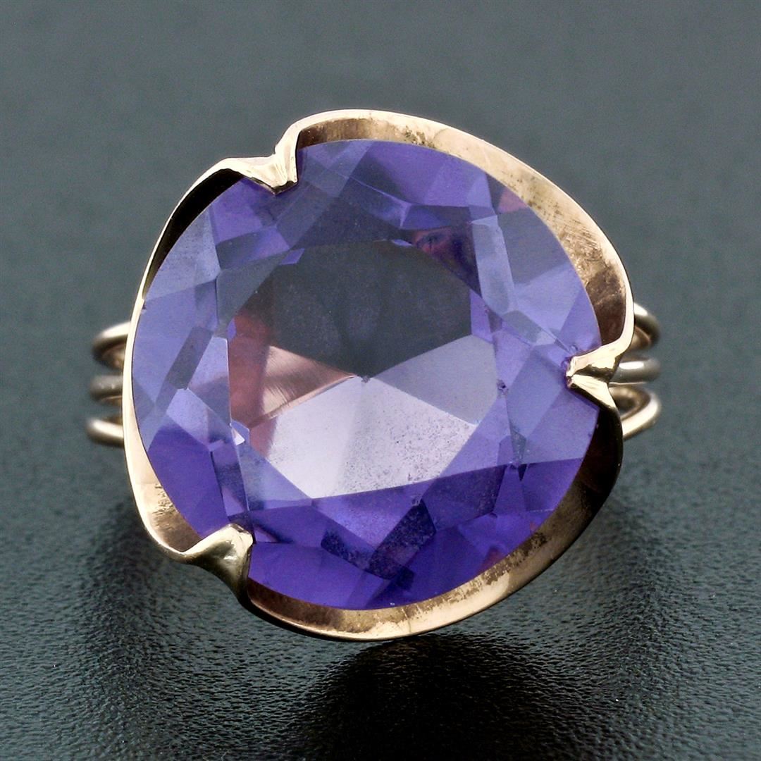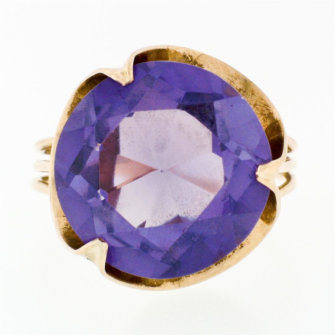 A vintage solid 14k rose gold solitaire ring, with 1 round cut synthetic alexandrite (13.7mm). The ring is size 5.5, weighs a total of 4.52 grams, and measures 15.75mm wide.