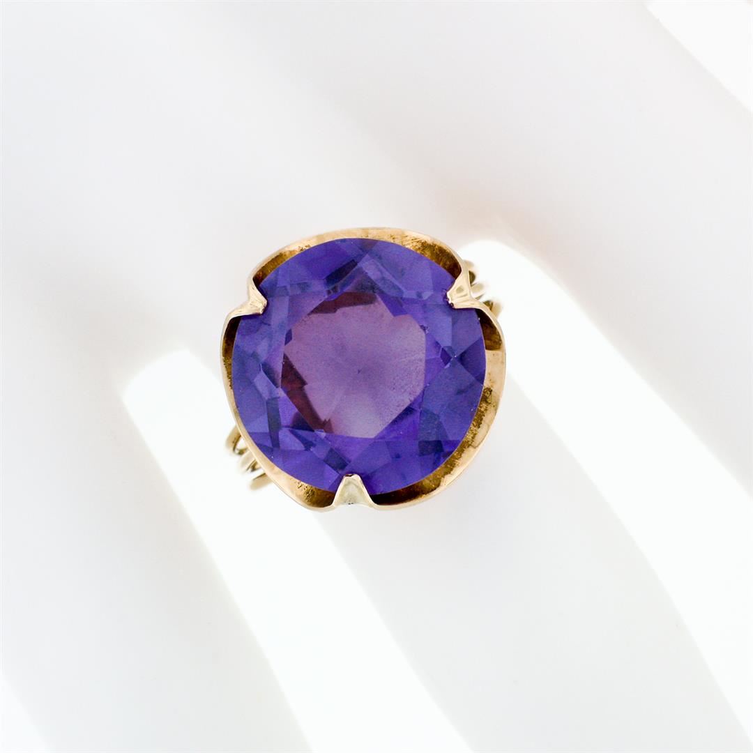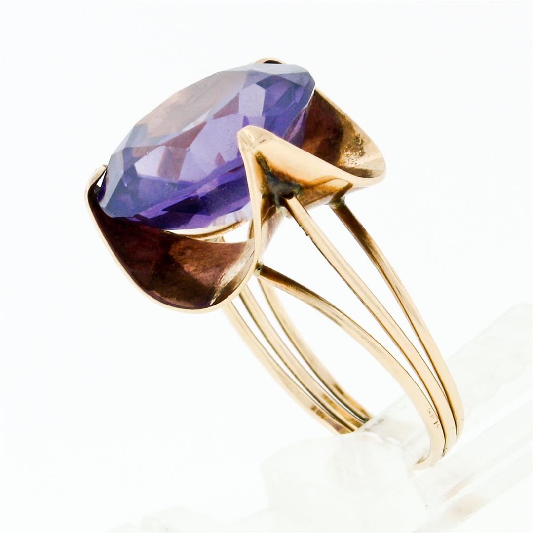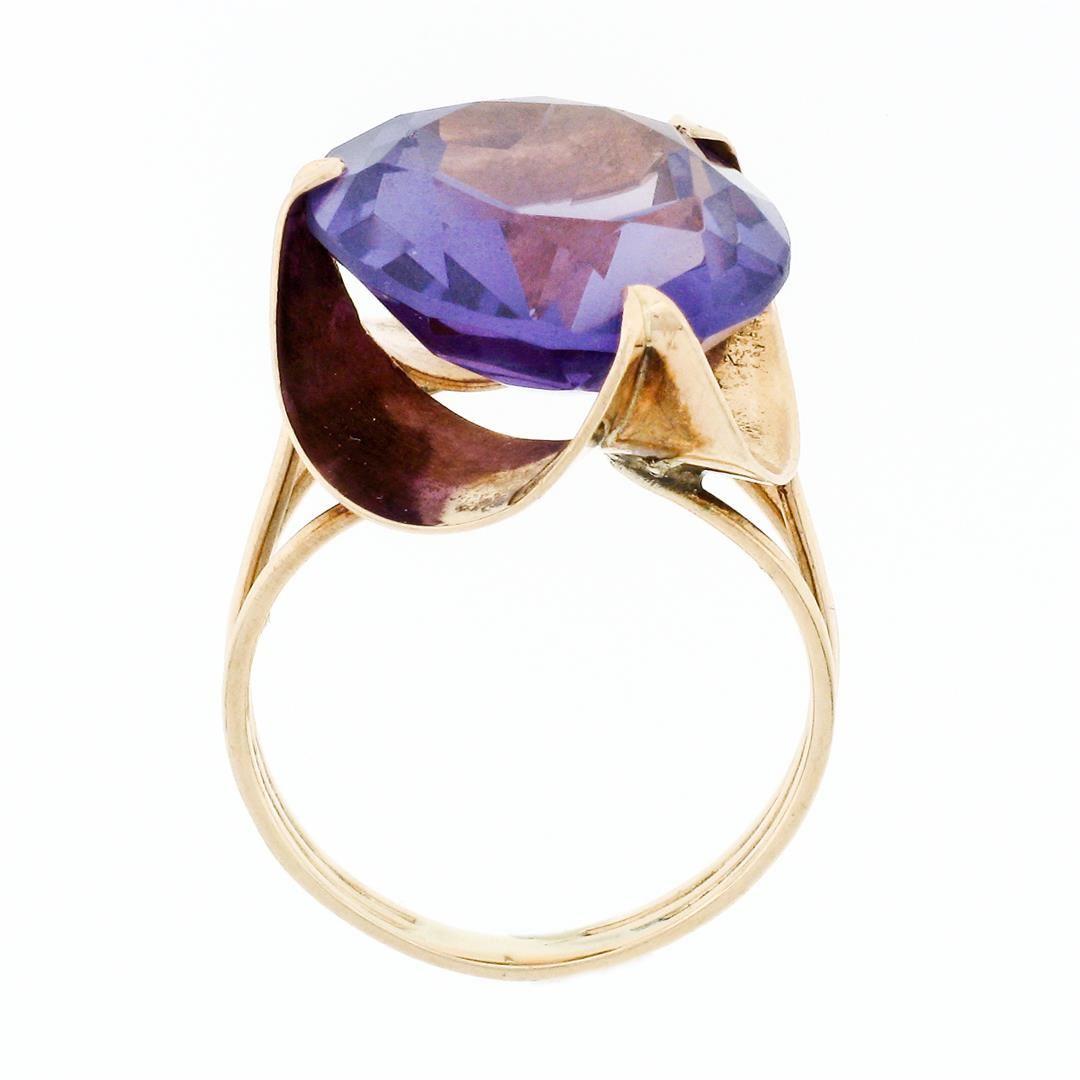A vintage solid 14k rose gold solitaire ring, with 1 round cut synthetic alexandrite (13.7mm). The ring is size 5.5, weighs a total of 4.52 grams, and measures 15.75mm wide.