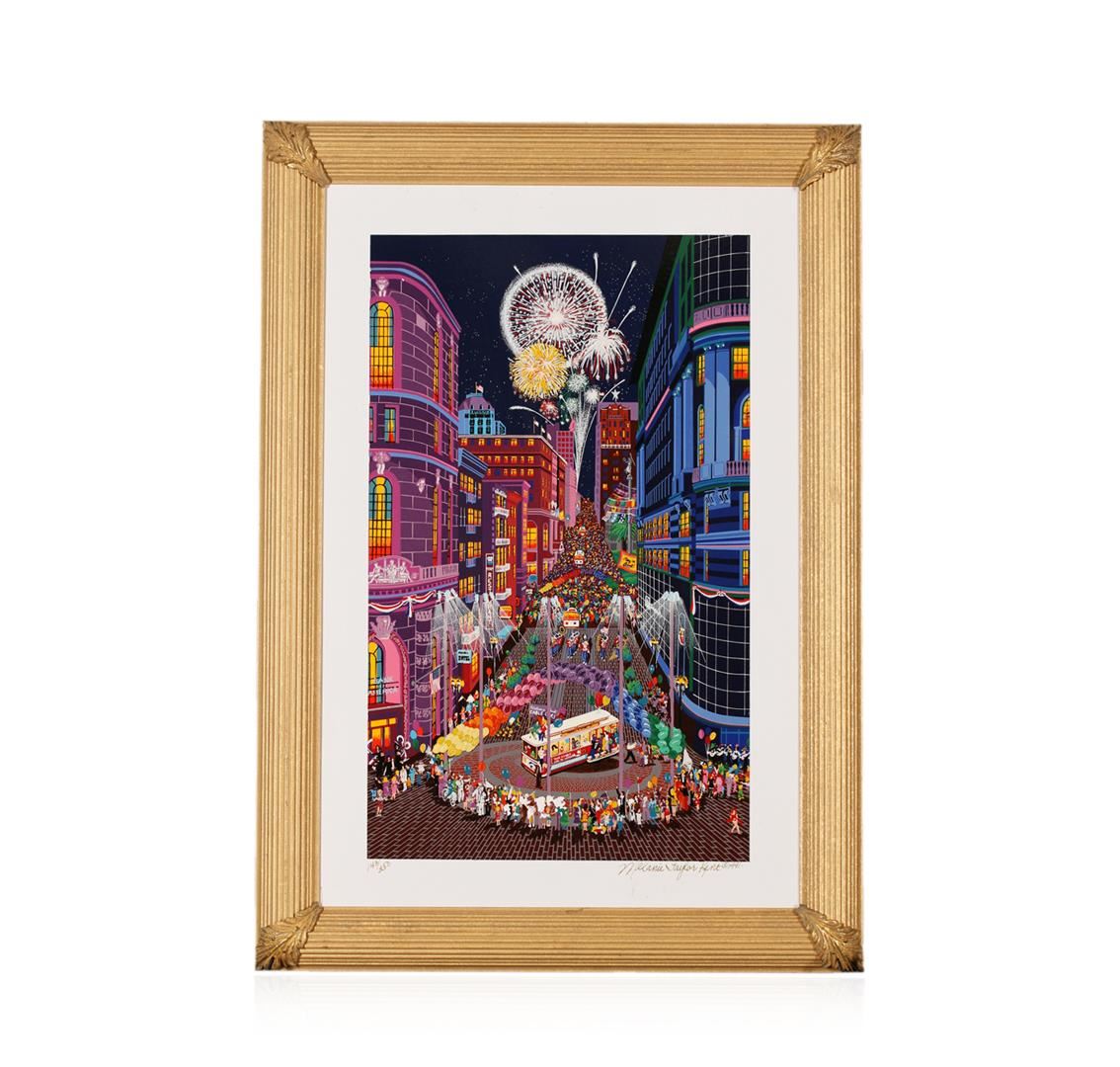 Return of the Cable Cars: Melanie Taylor Kent created a very limited number of her famous homage to the San Francisco Cable cars, on porcelain. Due to the difficulty and expense of printing on porcelain, this limited edition was never completed and only ac few pieces are known to be in circulation today. It is signed and numbered by the artist, and framed in a striking commemorative gold molding. This complex image was designed to celebrate the historic return of the Powell Street cable cars, after they were removed for repair and remodeling of the entire system during the 1990's. Slices of the original gigantic steel cables that pulled and lowered the trolley cars, can still be purchased as souvenirs at the base of the Powell Street turnaround, near the famous Ghiradelli Square. Limited Edition S/N Serigraph #143/350.