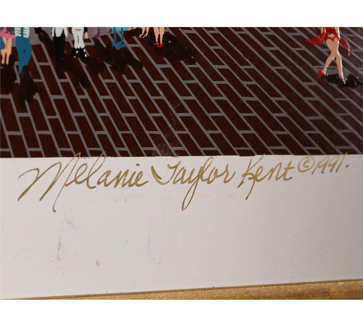 Return of the Cable Cars: Melanie Taylor Kent created a very limited number of her famous homage to the San Francisco Cable cars, on porcelain. Due to the difficulty and expense of printing on porcelain, this limited edition was never completed and only ac few pieces are known to be in circulation today. It is signed and numbered by the artist, and framed in a striking commemorative gold molding. This complex image was designed to celebrate the historic return of the Powell Street cable cars, after they were removed for repair and remodeling of the entire system during the 1990's. Slices of the original gigantic steel cables that pulled and lowered the trolley cars, can still be purchased as souvenirs at the base of the Powell Street turnaround, near the famous Ghiradelli Square. Limited Edition S/N Serigraph #143/350.