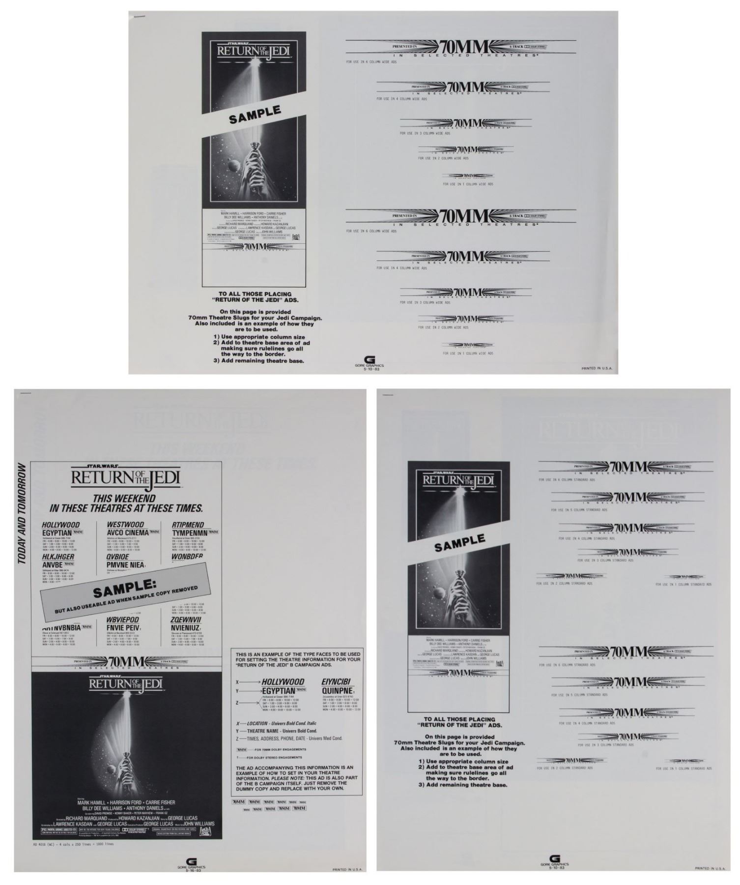 (LucasFilm, 1983) A set of (3) advertising campaign books created by Gore Graphics for "Return of the Jedi". These large books were addressed "to all those placing 'Return of the Jedi' ads" and provided a plethora of poster imagery and 70mm theatre slugs to be used in the promotion of the upcoming film. The official release of "Return of the Jedi" was on 5-25-83, with these pre-release campaign books dated 5-10-83 and 5-16-83. These (3) packets all measure 23"x17" and contain 18 total sheets of promotional graphics and information. The condition is good overall with some creasing and edge-wear.