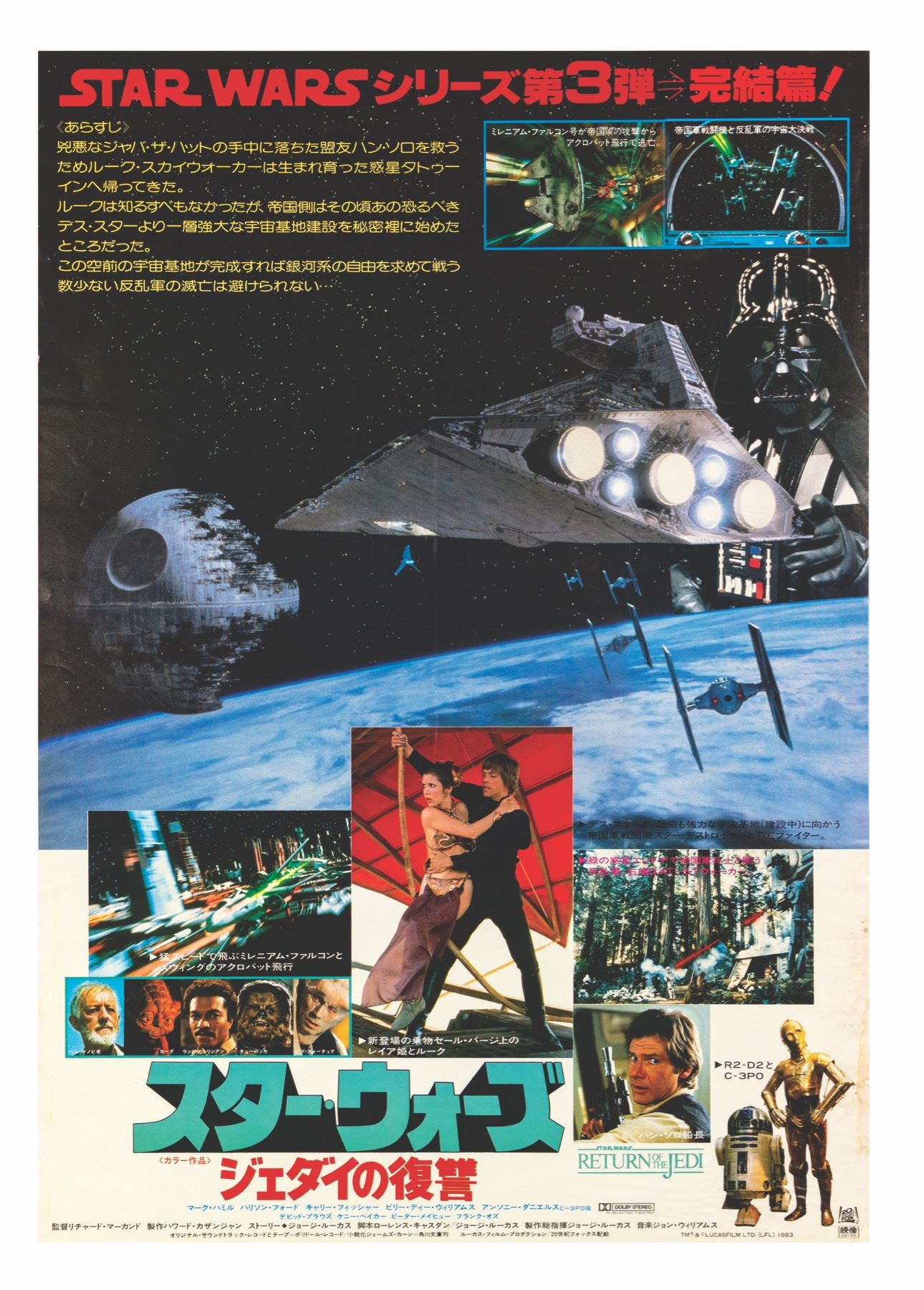 (LucasFilm, 1983) An original poster for the Japanese theatrical release of Return of the Jedi. poster that was made for Japan. The poster has imagery throughout that depicts locations and characters from the film including Endor, the Deathstar, Luke, Leia, and Han. The poster measures 28.5"x20.25" and is in good condition with some edge wear, particularly to the bottom of the right edge.