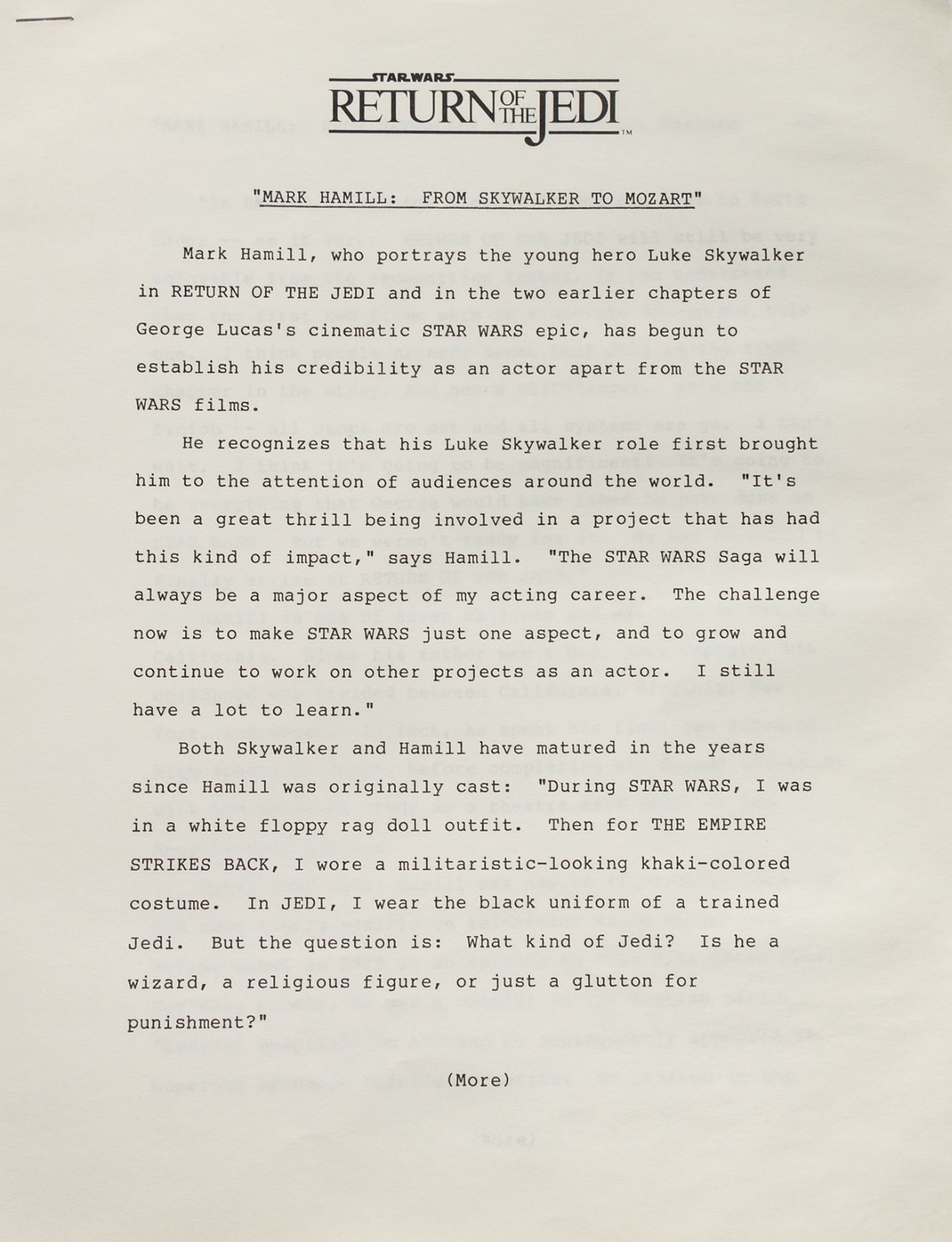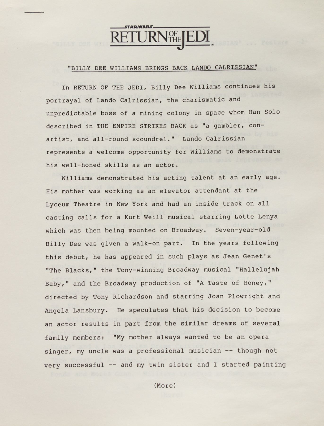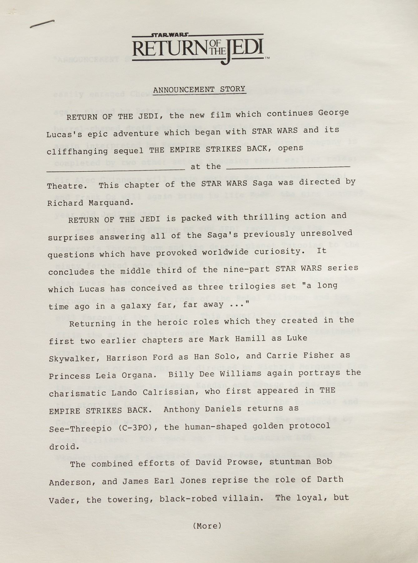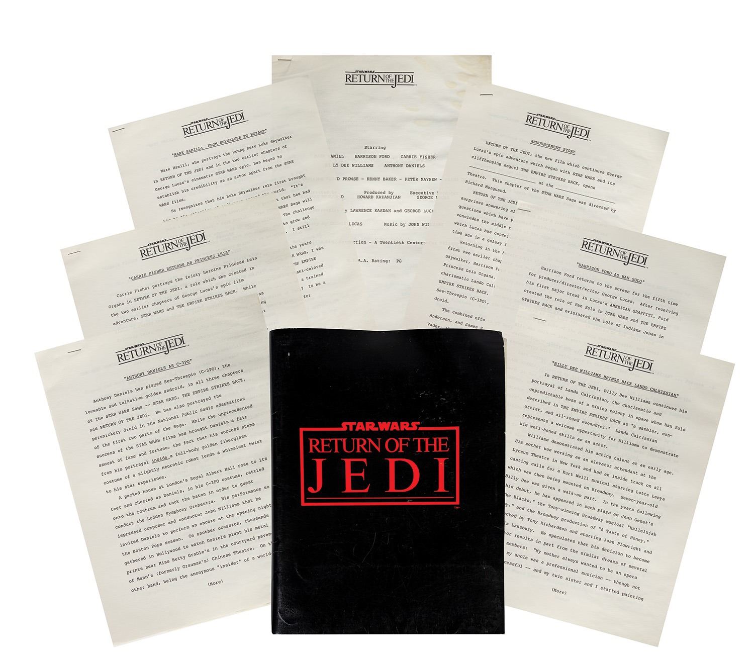 (20th Century Fox, 1983) An extremely rare Production Information Guide used during very early promotion of Return of the Jedi. This packet comes from the collection of Bill Wallen, who was given this information to use while he was creating early promotional and advertising campaigns for the film. The packet is composed of 11 sections, with a total of 81 pages of production information. The pages measure 11"x8.5" and the condition is poor to fair with some moister staining on a few sheets and a wavy quality to a few pages.