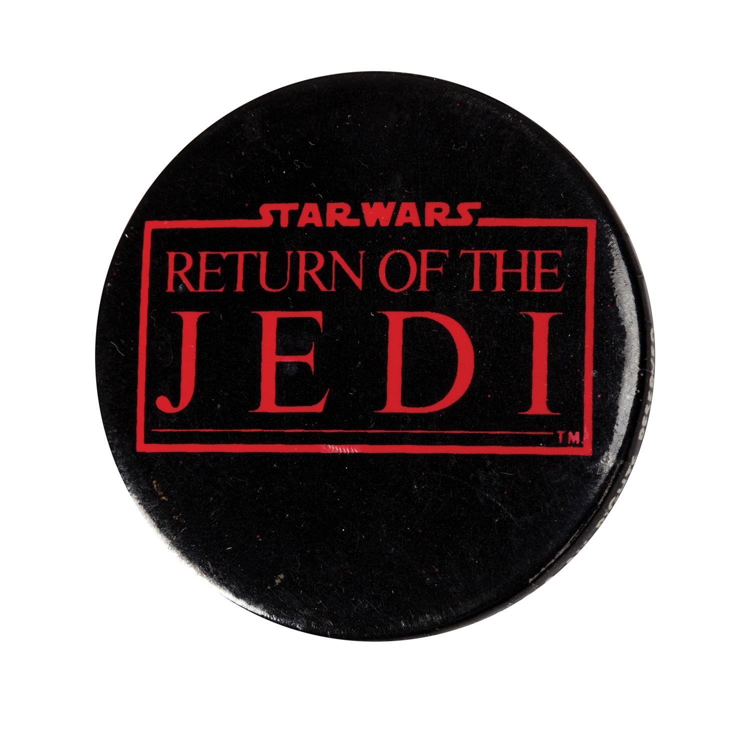 (Lucasfilm, 1983) An original button created by Adam Joseph Industries Inc. as a promotional item for Return of the Jedi. Featuring the film's title on the front and a locking pin on the reverse, the button measures 2.25" in diameter. The condition is good overall with minor surface wear from use, and a few small spots of rusting to the metal on the reverse.