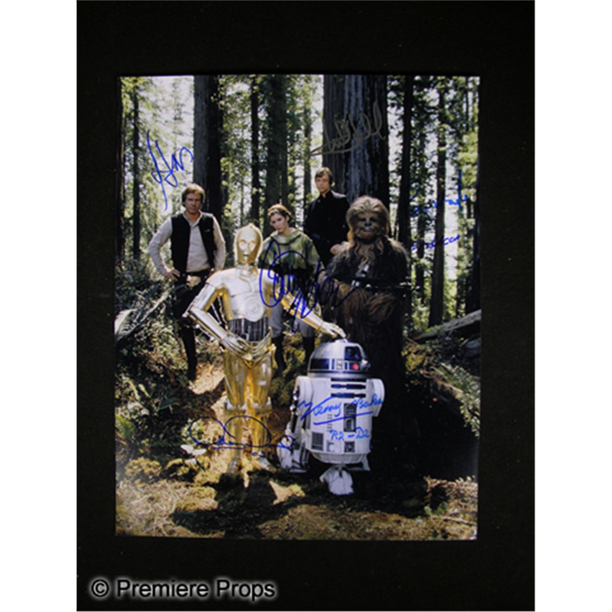 Oversized color photo from Return of the Jedi (1983) signed by the central cast: Mark Hamill (Luke), Carrie Fisher(Princess Leia), Kenny Baker (R2-D2), Harrison Ford (Han Solo), Anthony Daniels (C-3PO)and Peter Mayhew (Chewbacca).