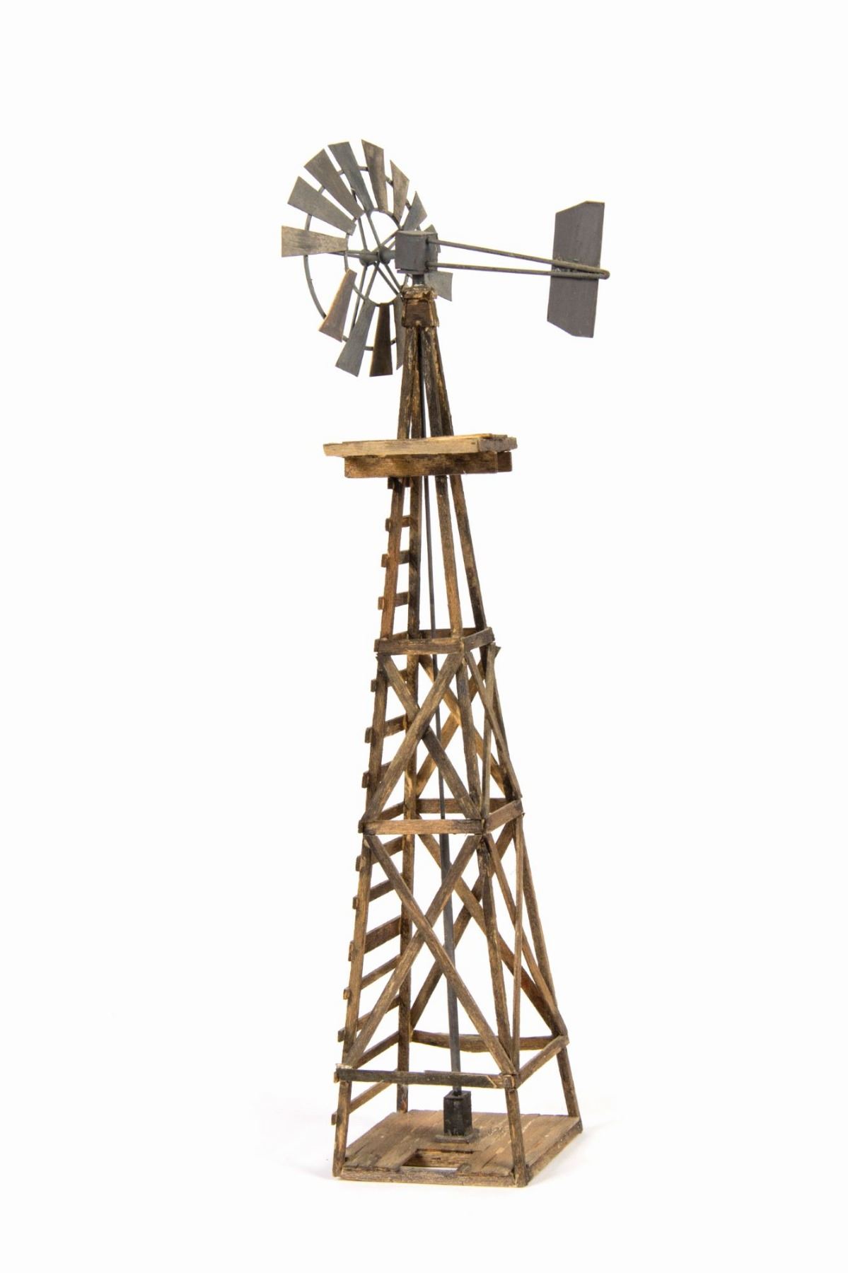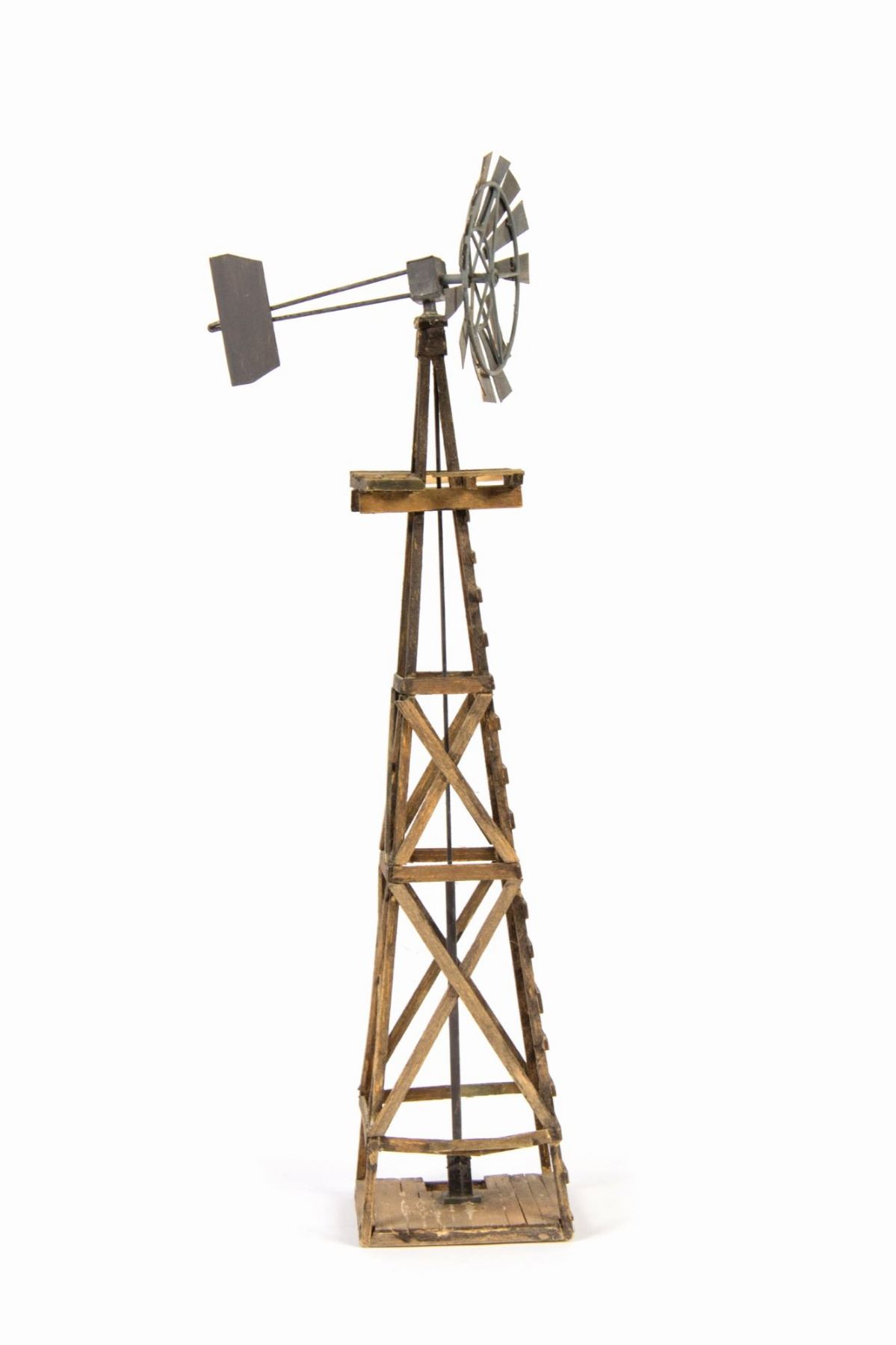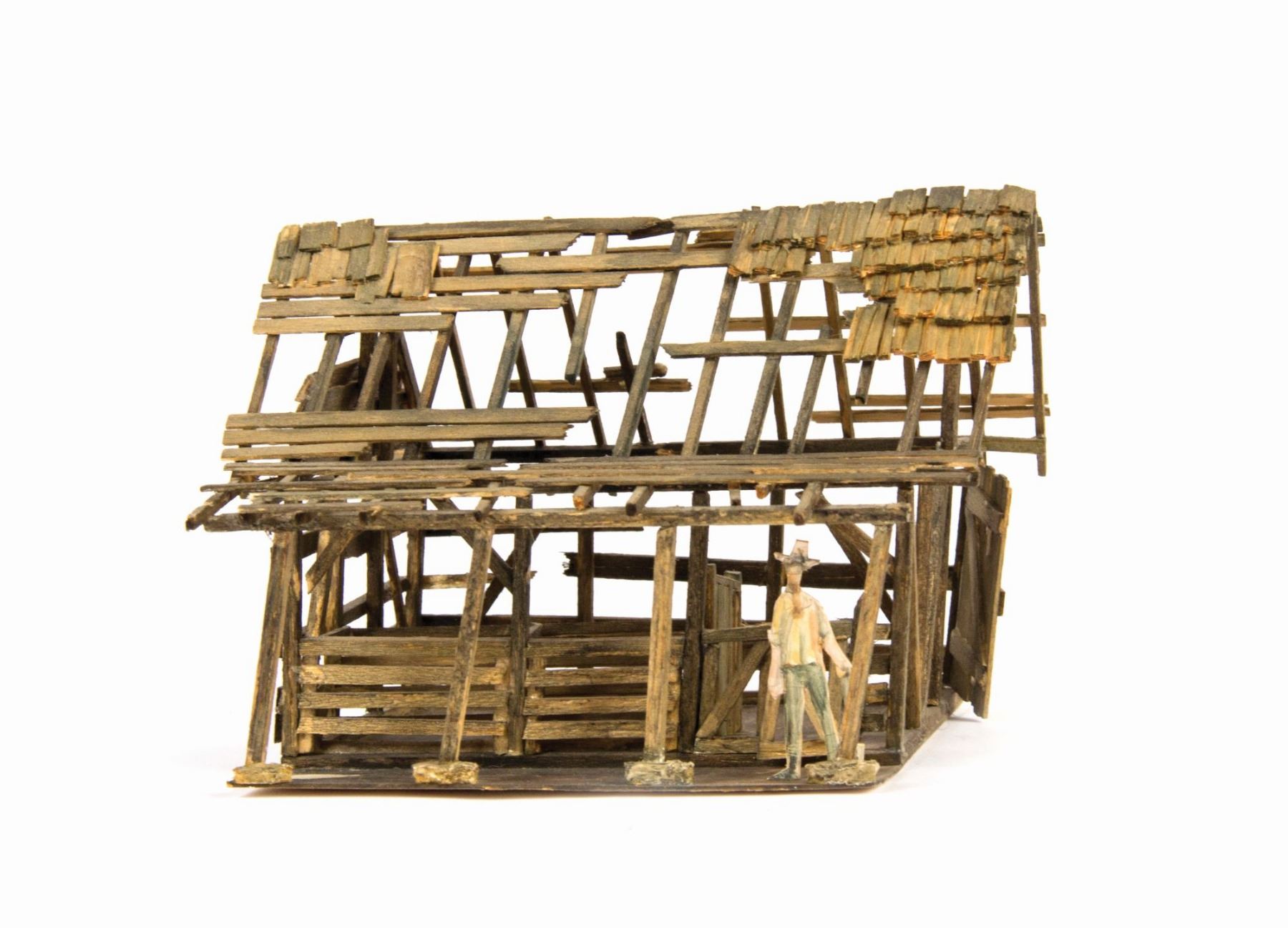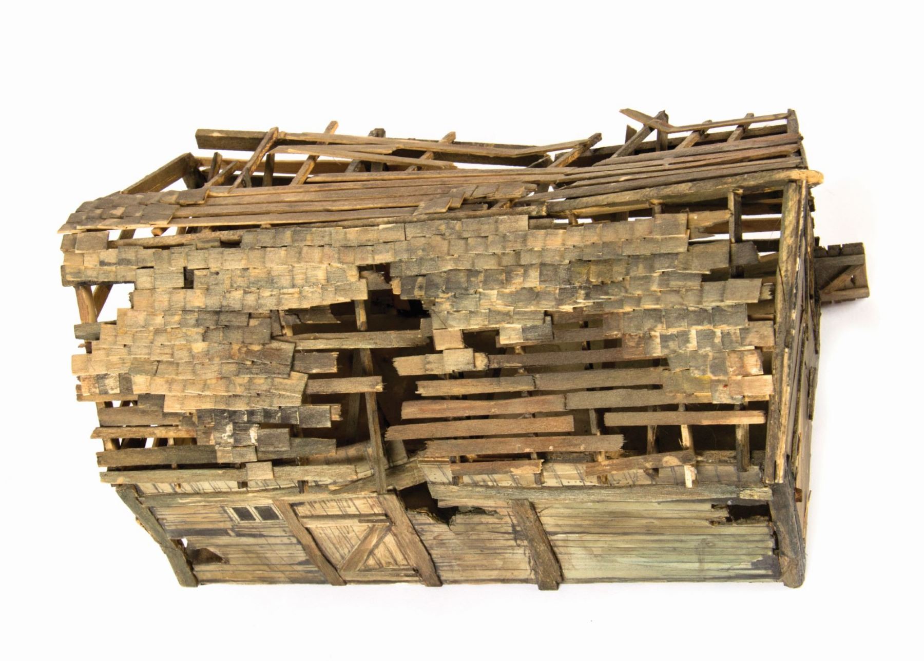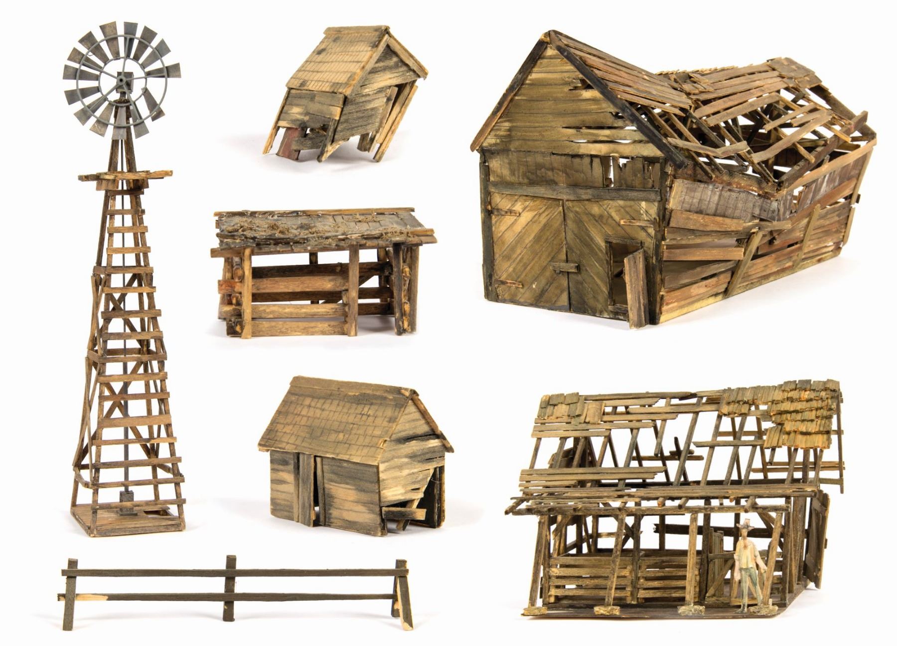 (Disney, 1985) A set of miniature prop models of a barn and windmill created for the 1985 feature film "Return to Oz". An unofficial sequel to the original "The Wizard of Oz", this film follows Dorothy in a new adventure that pays tribute to the original. This model depicts several separate pieces of the barn, all distressed to show the wear from the tornado. Constructed in lightweight wood, the tallest of the model sections measures 10" tall. The models are in fair to good condition, with some wear throughout from use and storage.