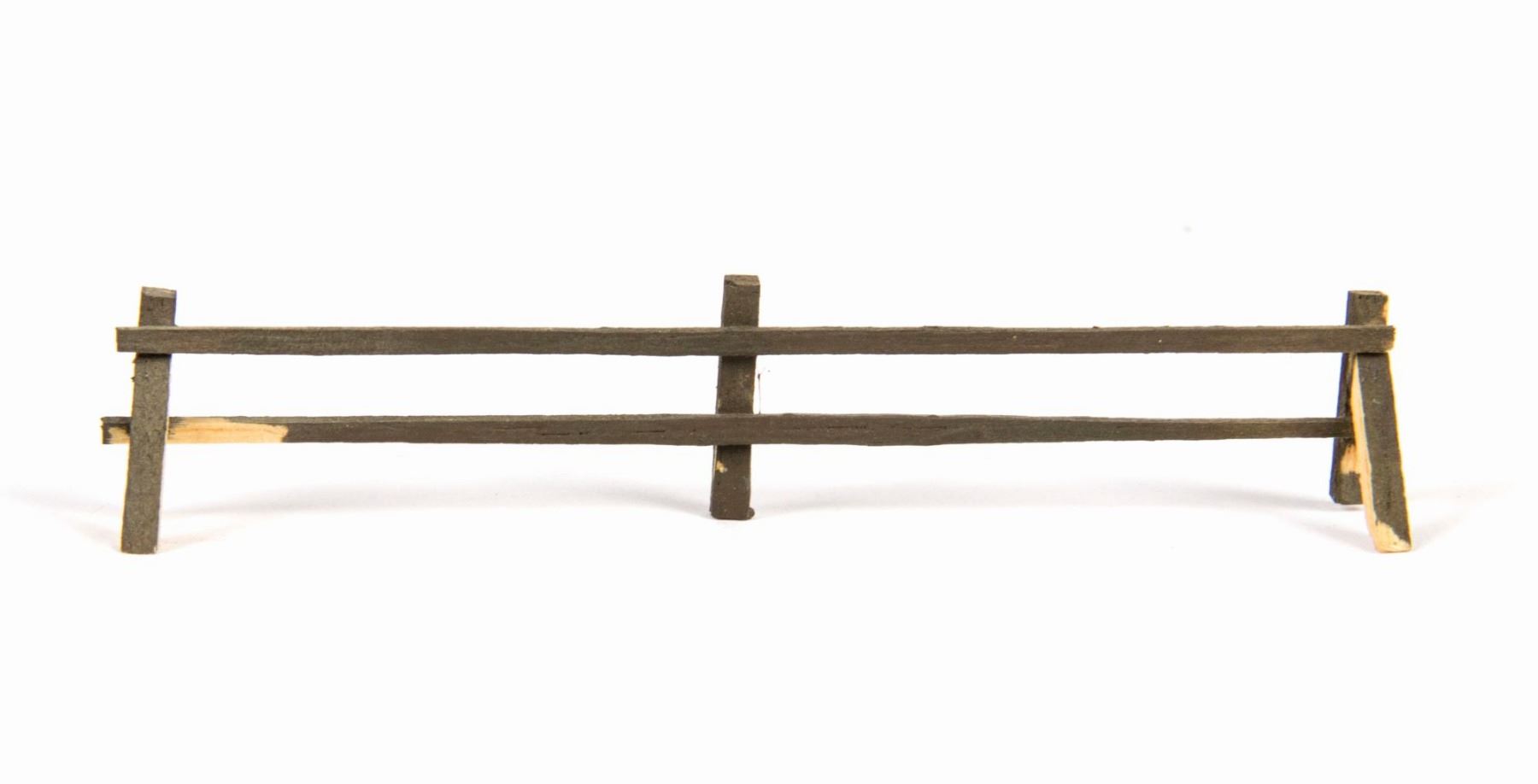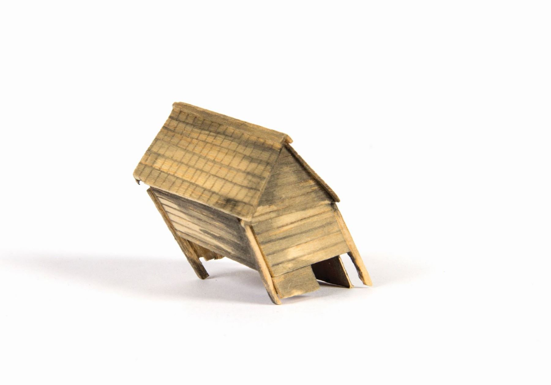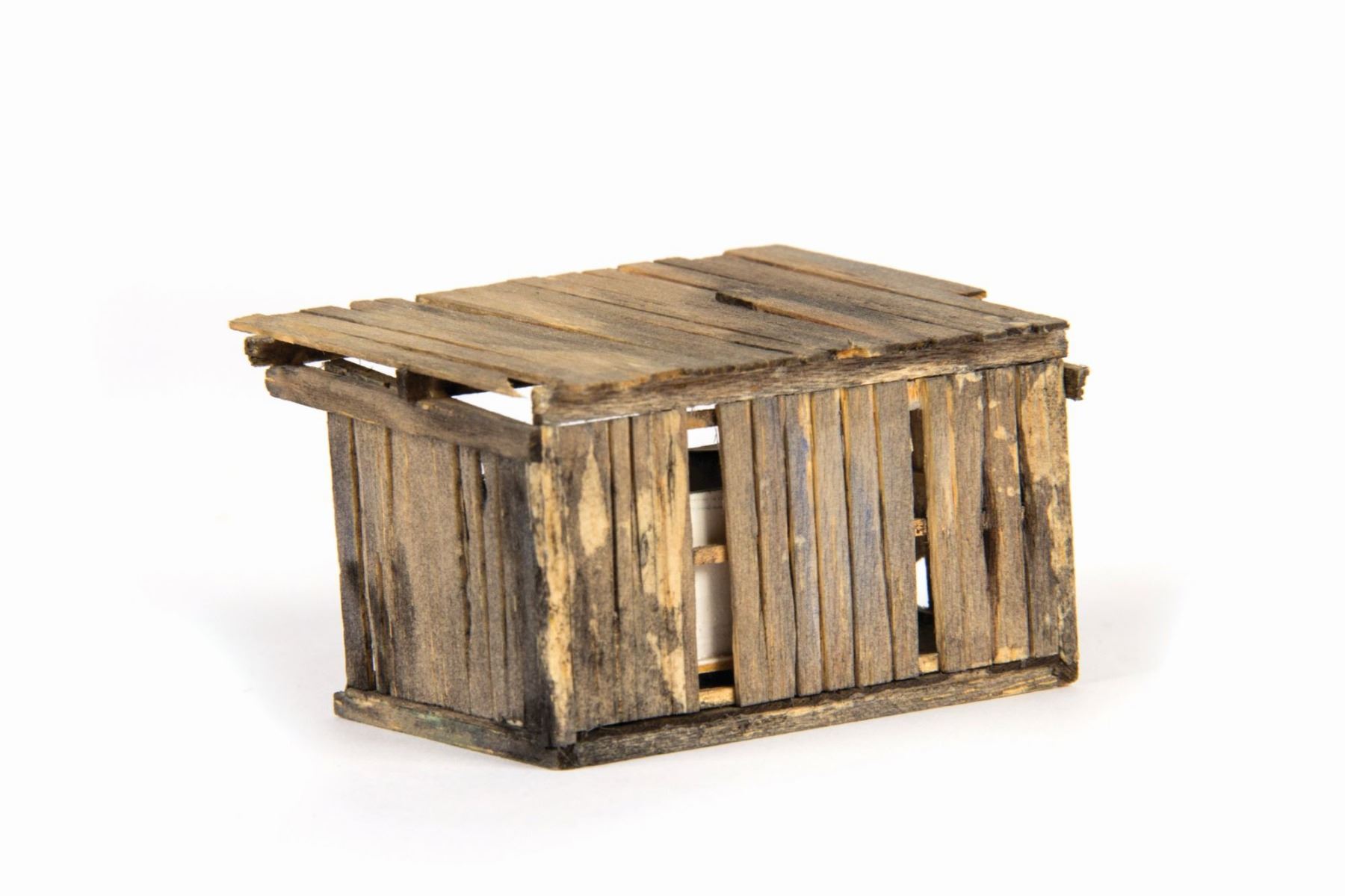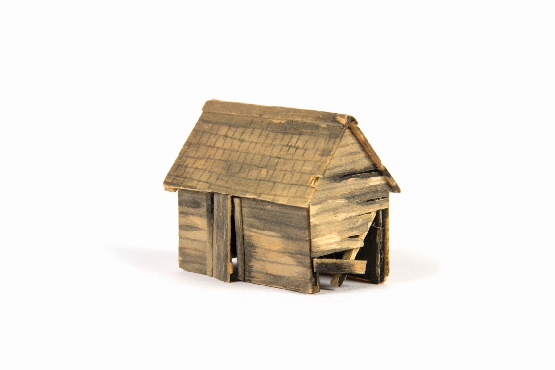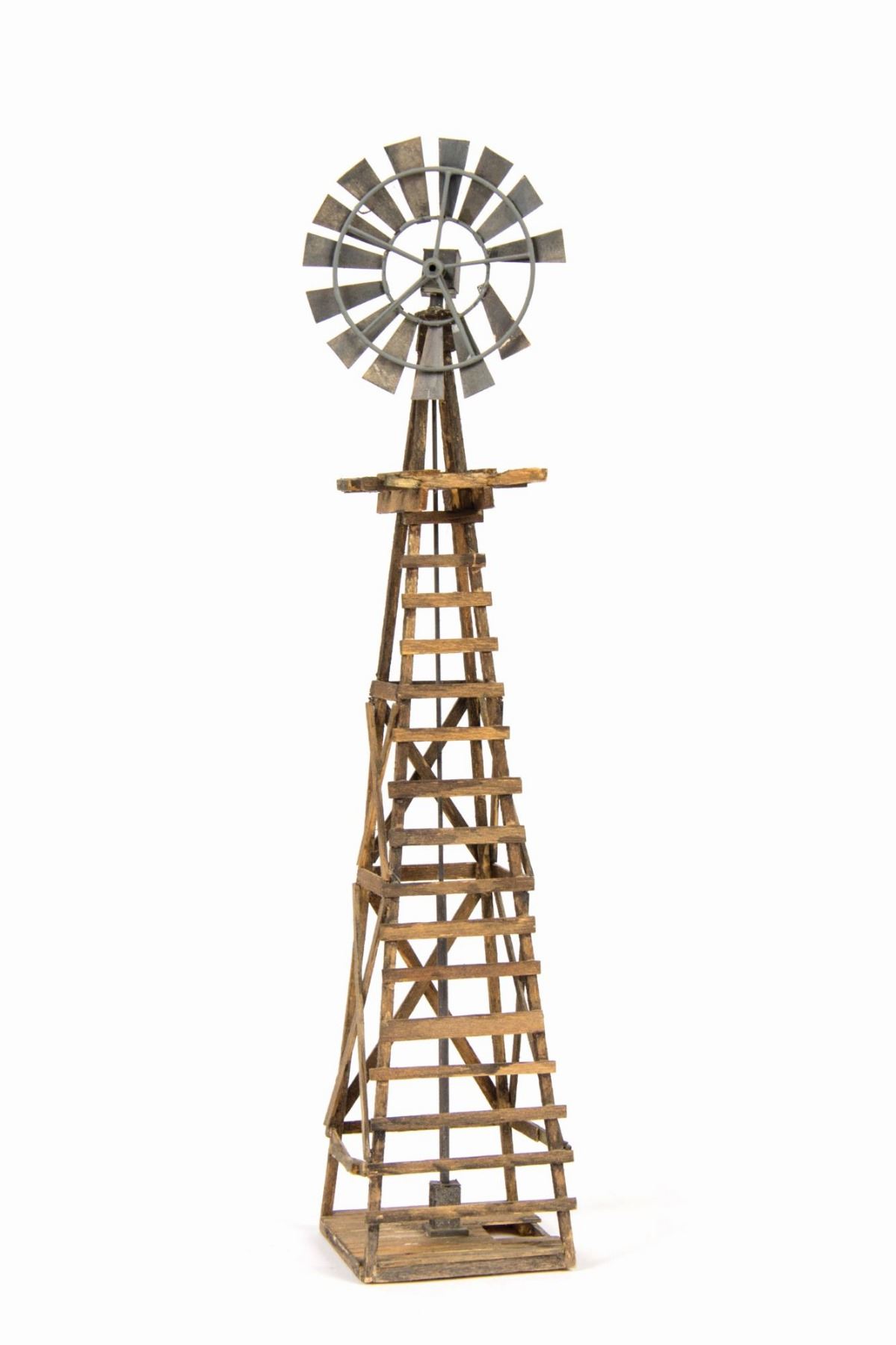 (Disney, 1985) A set of miniature prop models of a barn and windmill created for the 1985 feature film "Return to Oz". An unofficial sequel to the original "The Wizard of Oz", this film follows Dorothy in a new adventure that pays tribute to the original. This model depicts several separate pieces of the barn, all distressed to show the wear from the tornado. Constructed in lightweight wood, the tallest of the model sections measures 10" tall. The models are in fair to good condition, with some wear throughout from use and storage.