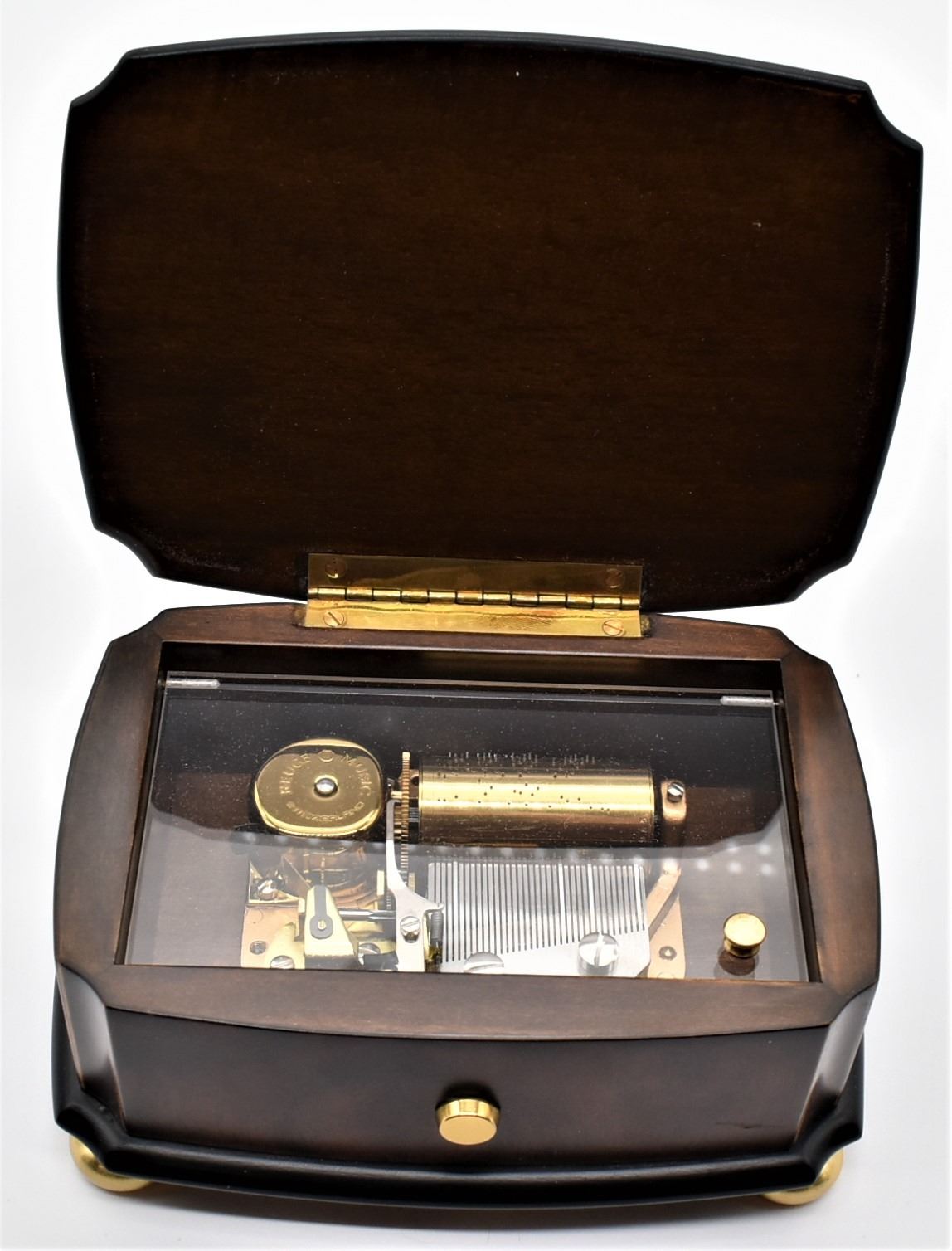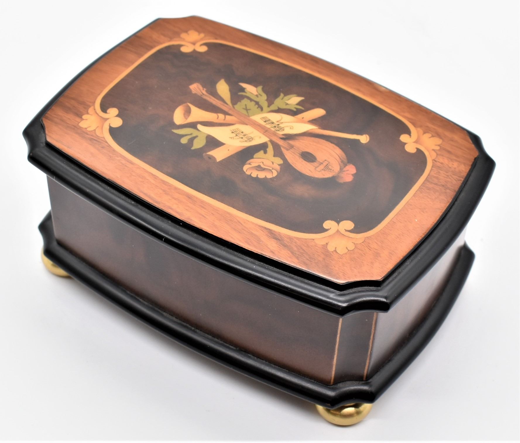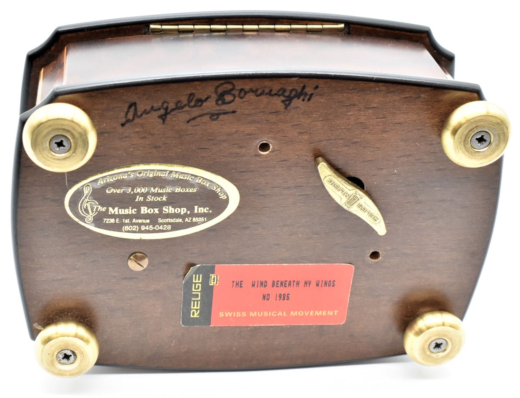 Reuge Swiss Movement Music Box by Angelo Boruaghi, measures 5.75'' x 3.75'' x 2.5''H and is signed on the bottom, plays ''Wind Beneath my Wings'', wind up on the bottom then slide gold knob below lid to play, traditional inlay wood Swiss music box, small indentation on lid