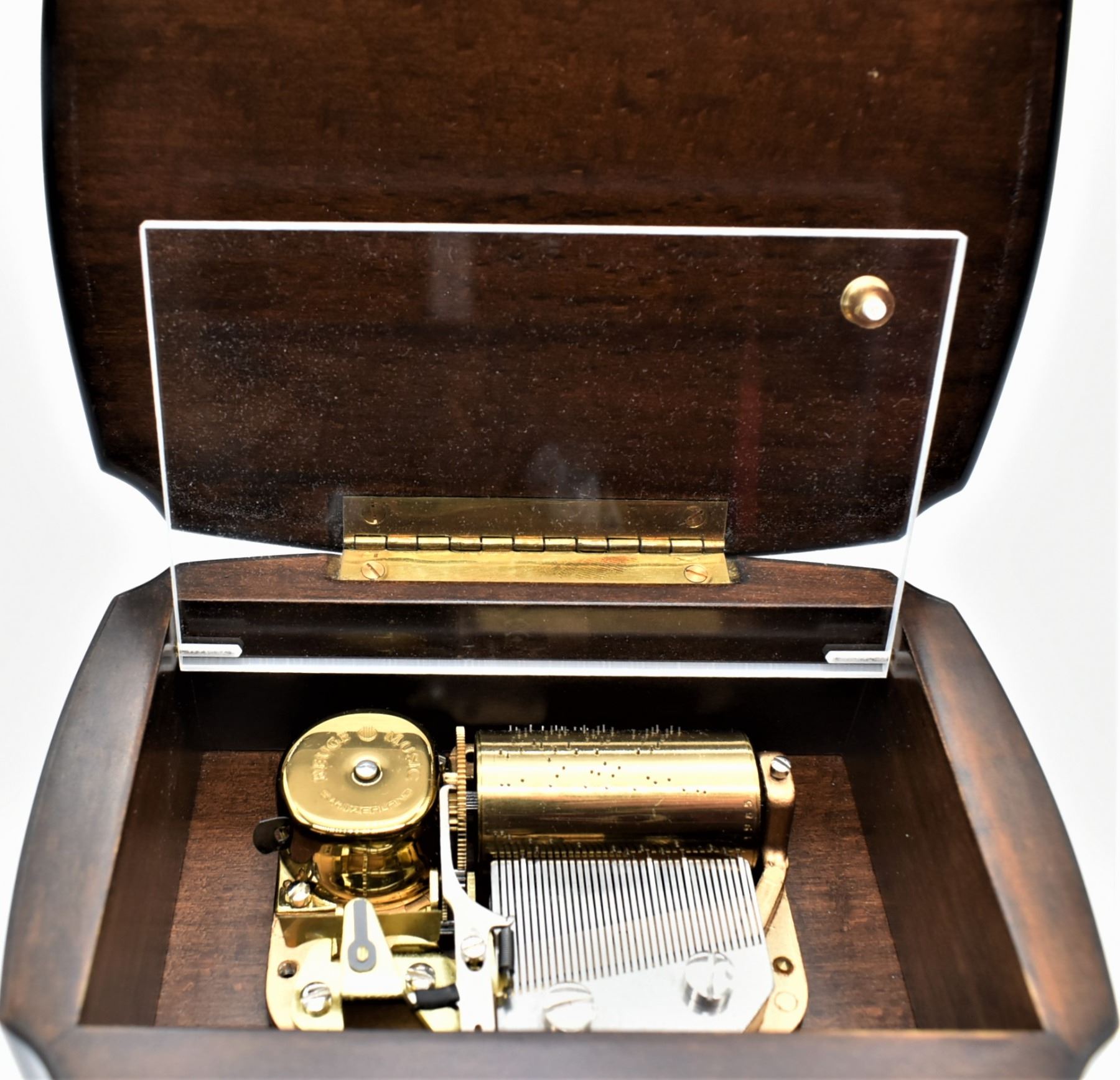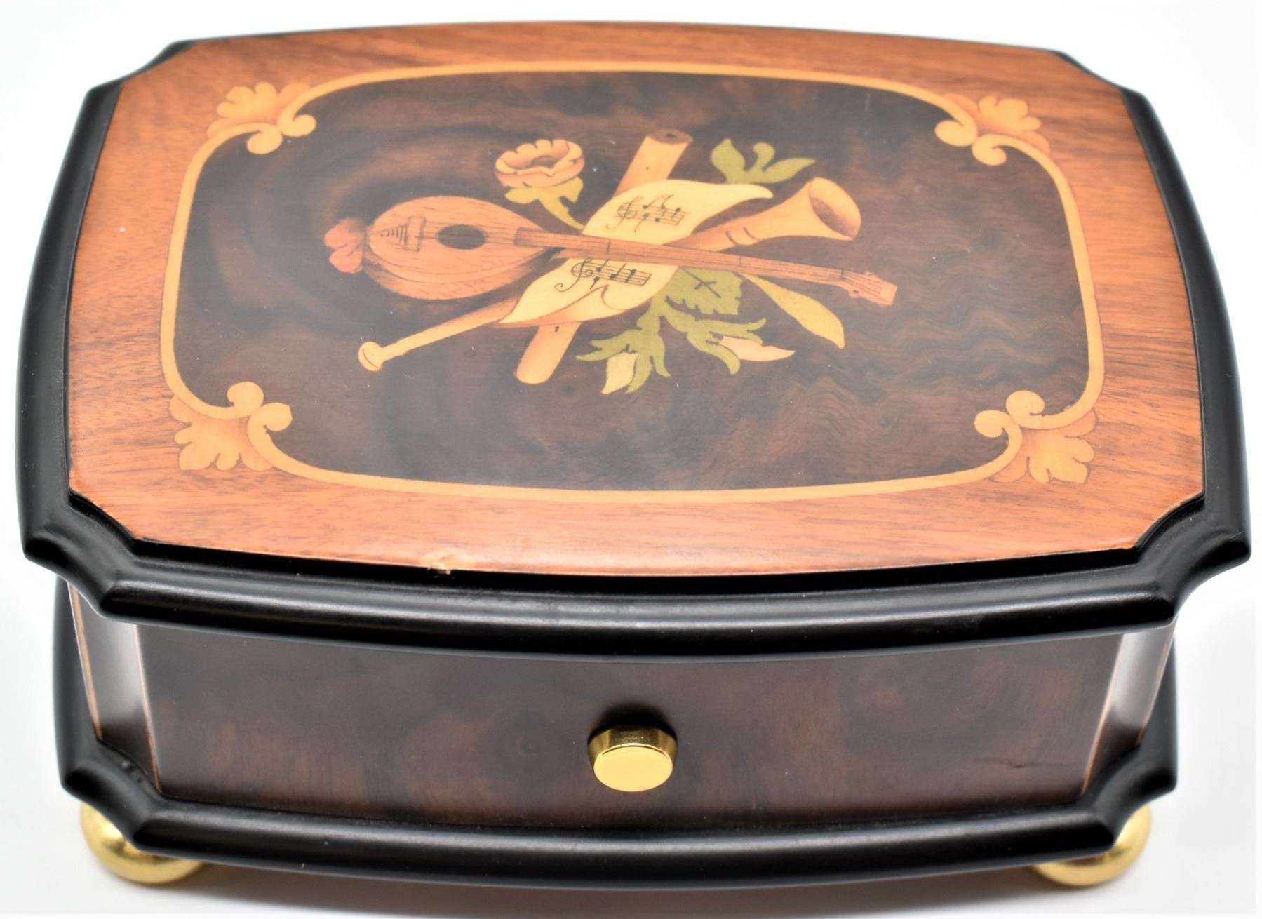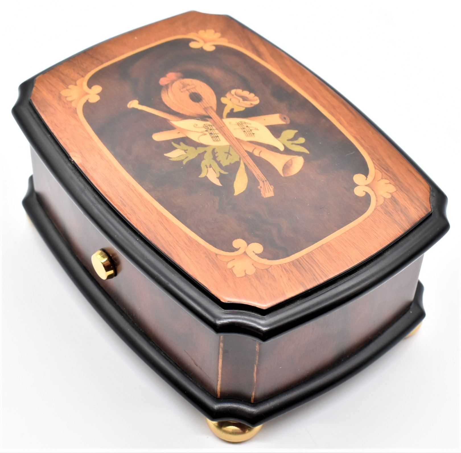 Reuge Swiss Movement Music Box by Angelo Boruaghi, measures 5.75'' x 3.75'' x 2.5''H and is signed on the bottom, plays ''Wind Beneath my Wings'', wind up on the bottom then slide gold knob below lid to play, traditional inlay wood Swiss music box, small indentation on lid