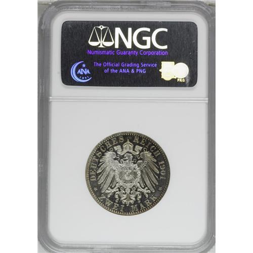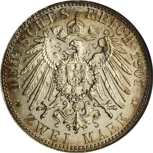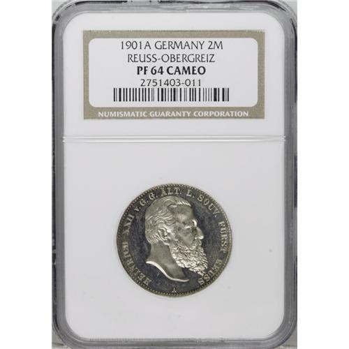 <B>Reuss-Obergreiz. Heinrich XXII 2 Mark 1901A,</B></I> KM128, Proof 64 Cameo NGC. Lightly toned with minor contact marks. Quite scarce in the nicer grades of Proof.<BR><BR><b>Shipping:</b> Coin/Currency (<a target="_blank" href="http://www.heritageauctions.com/common/shipping.php">view shipping information</a>)