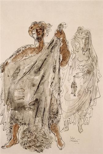 <B>Reuven Rubin</B><BR><BR>1893 - 1974<BR><BR>Israeli Art<BR><BR>The Fisherman and his Family<BR><BR>Watercolor<BR><BR>75x50 cm<BR><BR>Signed.<BR><BR>Dalzell Hatfield Galleries<BR><BR>Ambassador Hotel<BR><BR>Los Angels.<BR><BR>item from abroad