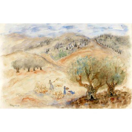 Reuven Rubin, Romanian and Israeli Art, 1893 - 1974, Olive Harvest, Watercolor, 36x55cm, Signed., , , , ,