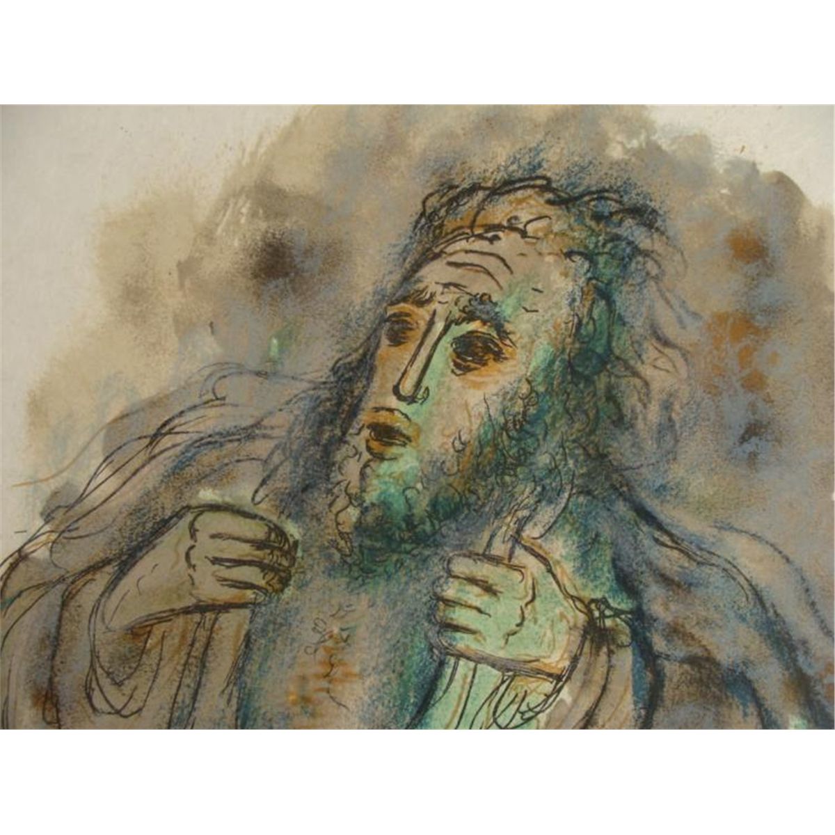 God gives Abraham the ultimate test by telling him to sacrifice his only son, Issac. The intensity of the scene is heightened by the dramatic poses and colors in this stunning print. * Artist: Reuven Rubin Signature: In pencil, lower right Title: Abraham's Sacrifice of Isaac Medium: Lithograph on Japon paper Edition: Proof Size: 20 x 25 1/2 inches Condition: Excellent Biography: * Reuven Rubin (1893-1947) was born in Romania to a poor, Jewish Hasidic family, and later studied art there, as well as in Paris. He developed a style influenced by the work of Henri Rousseau. In Palestine, he was one of the founders of the new Eretz Yisrael style, with a folk and naive appearance. His subjects were often the biblical landscape, folklore and people. He became quite popular, despite his opposition to the modern art schools of Jerusalem. Today he is recognized as an important figure in the history of Israeli art. His work can be found in many public and private collections around the world. *