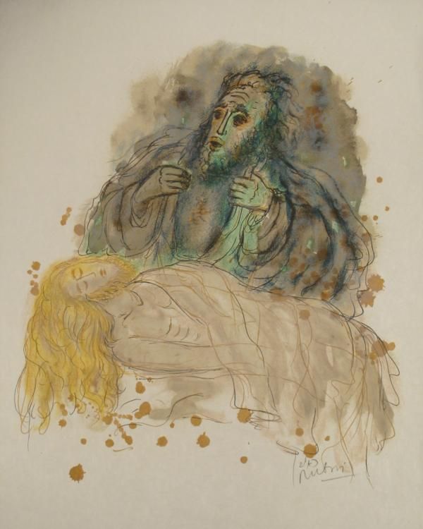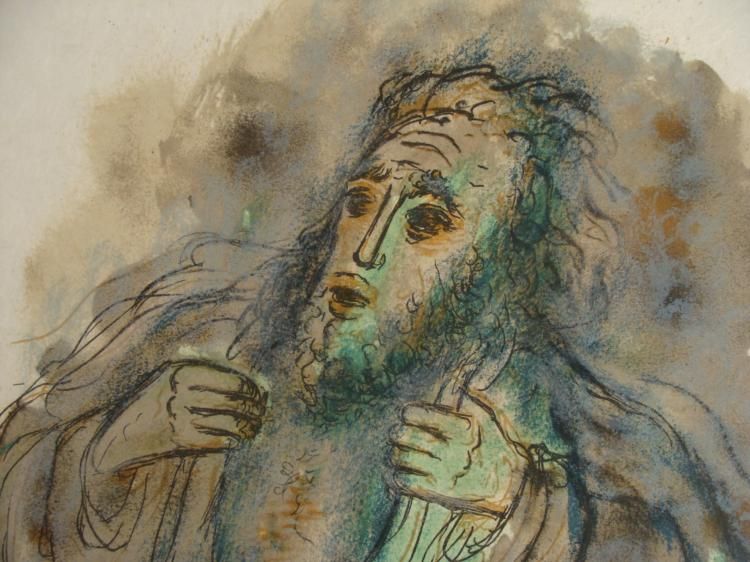 God gives Abraham the ultimate test by telling him to sacrifice his only son, Issac. The intensity of the scene is heightened by the dramatic poses and colors in this stunning print. * Artist: Reuven Rubin Signature: In pencil, lower right Title: Abraham's Sacrifice of Isaac Medium: Lithograph on Japon paper Edition: Proof Size: 20 x 25 1/2 inches Condition: Excellent Biography: * Reuven Rubin (1893-1947) was born in Romania to a poor, Jewish Hasidic family, and later studied art there, as well as in Paris. He developed a style influenced by the work of Henri Rousseau. In Palestine, he was one of the founders of the new Eretz Yisrael style, with a folk and naive appearance. His subjects were often the biblical landscape, folklore and people. He became quite popular, despite his opposition to the modern art schools of Jerusalem. Today he is recognized as an important figure in the history of Israeli art. His work can be found in many public and private collections around the world. *