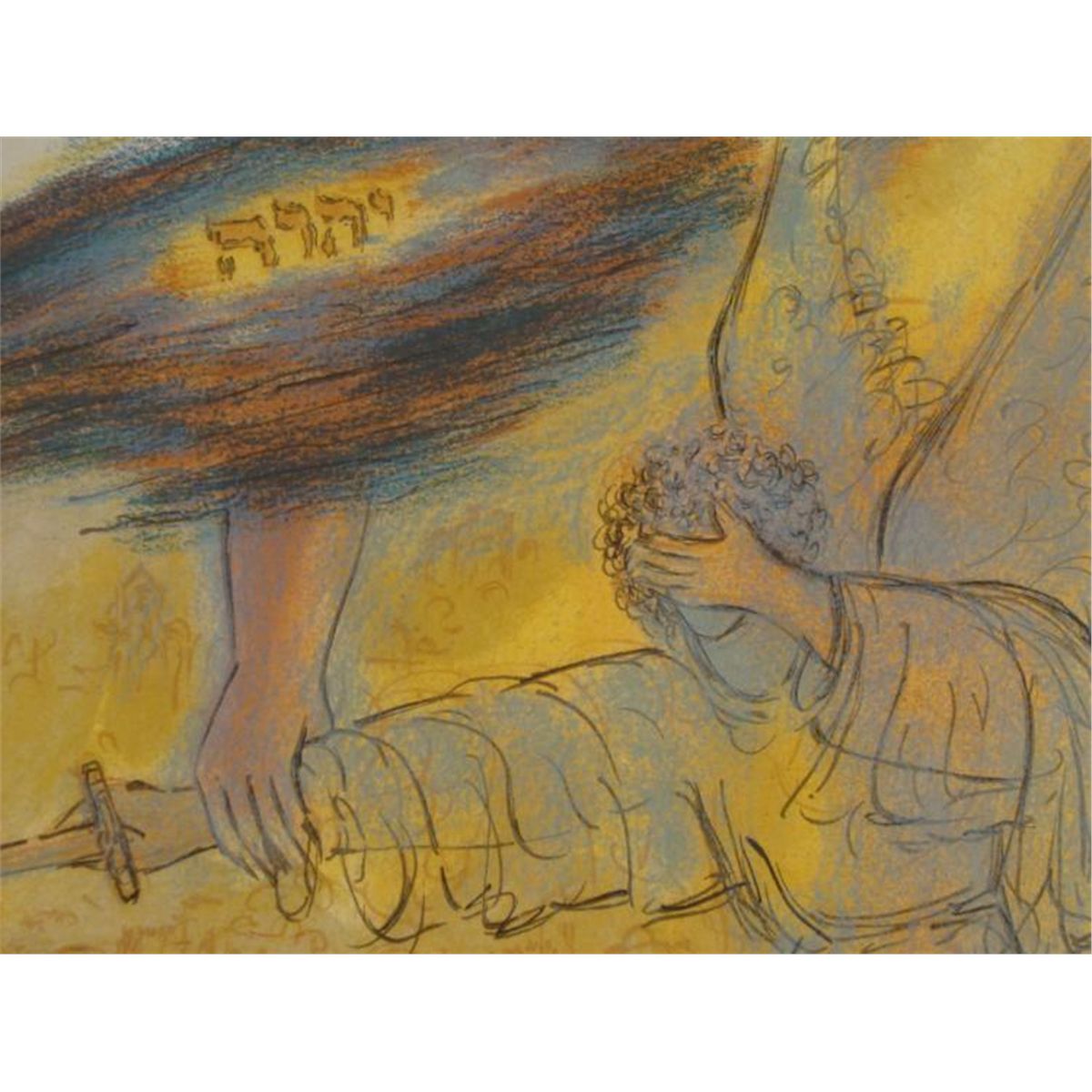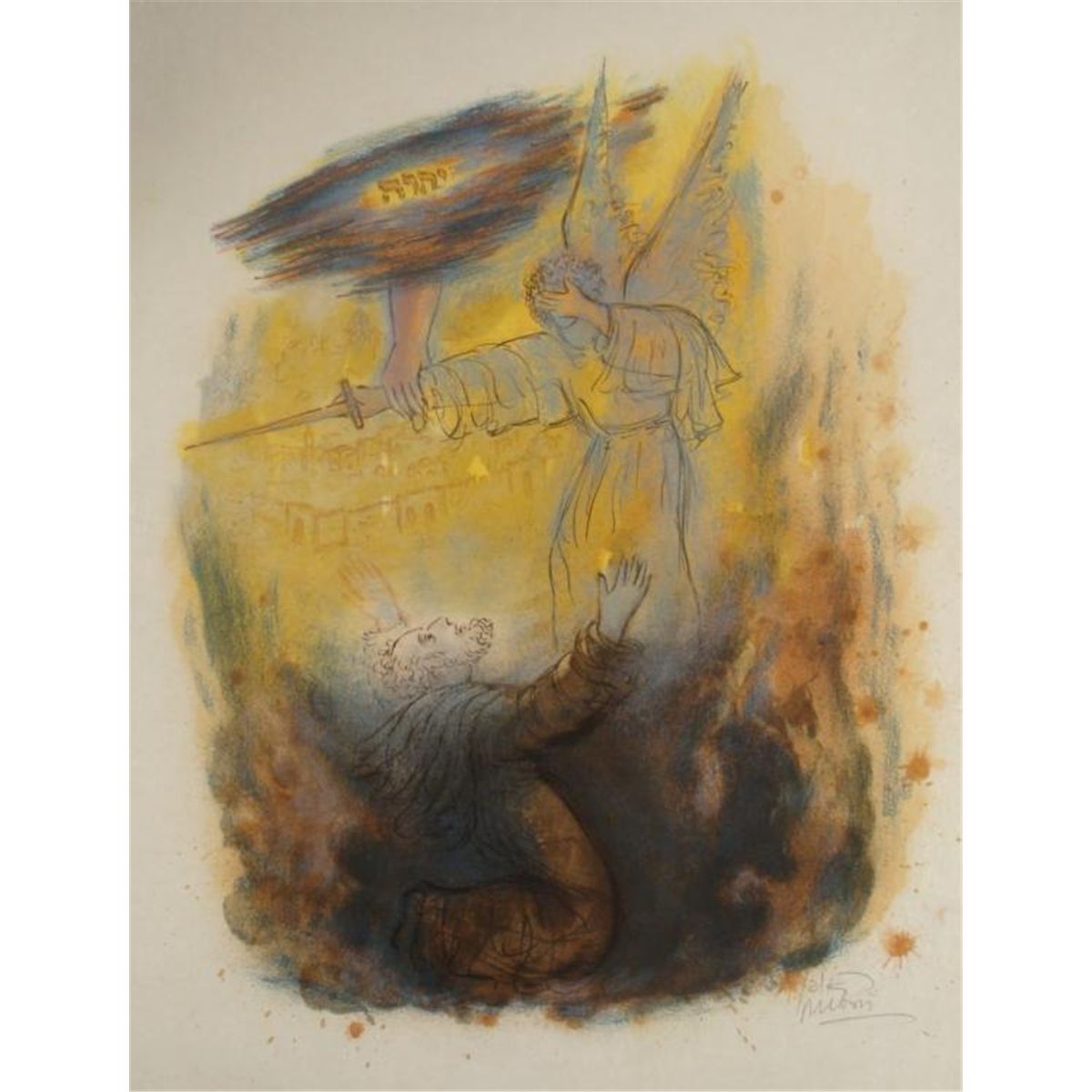 In this Biblical scene, the destroying angel is restrained at the threshing-floor of Ornan, at David's intercession. The vibrant yellows contrasting with dark colors create a dramatic atmosphere. * Artist: Reuven RubinSignature: In pencil, lower rightTitle: David Interceding with the AngelMedium: Lithograph on Japon paperEdition: ProofSize: 20 x 25 1/2 inchesCondition: ExcellentBiography: * Reuven Rubin (1893-1947) was born in Romania to a poor, Jewish Hasidic family, and later studied art there, as well as in Paris. He developed a style influenced by the work of Henri Rousseau. In Palestine, he was one of the founders of the new Eretz Yisrael style, with a folk and naive appearance. His subjects were often the biblical landscape, folklore and people. He became quite popular, despite his opposition to the modern art schools of Jerusalem. Today he is recognized as an important figure in the history of Israeli art. His work can be found in many public and private collections around the world. * *