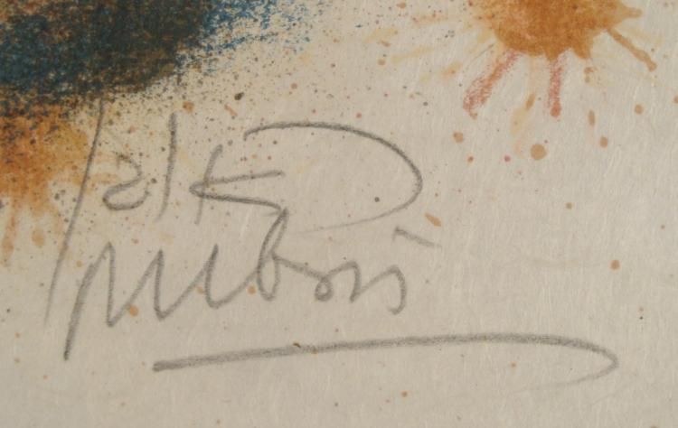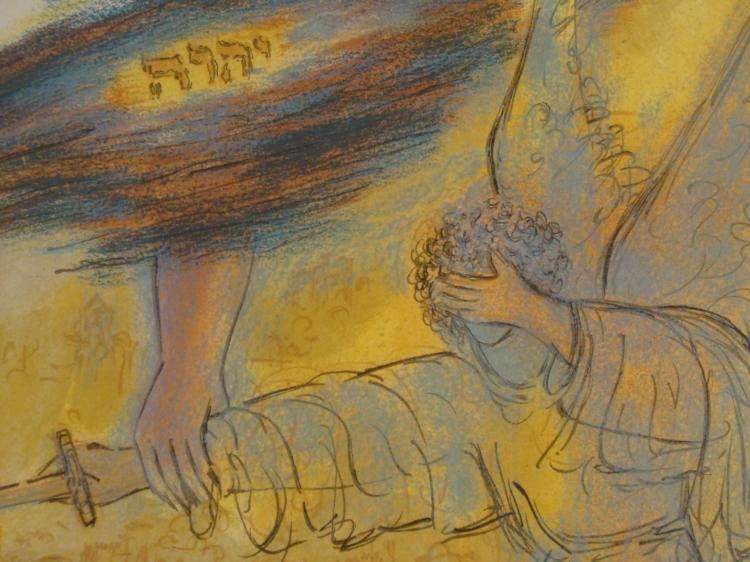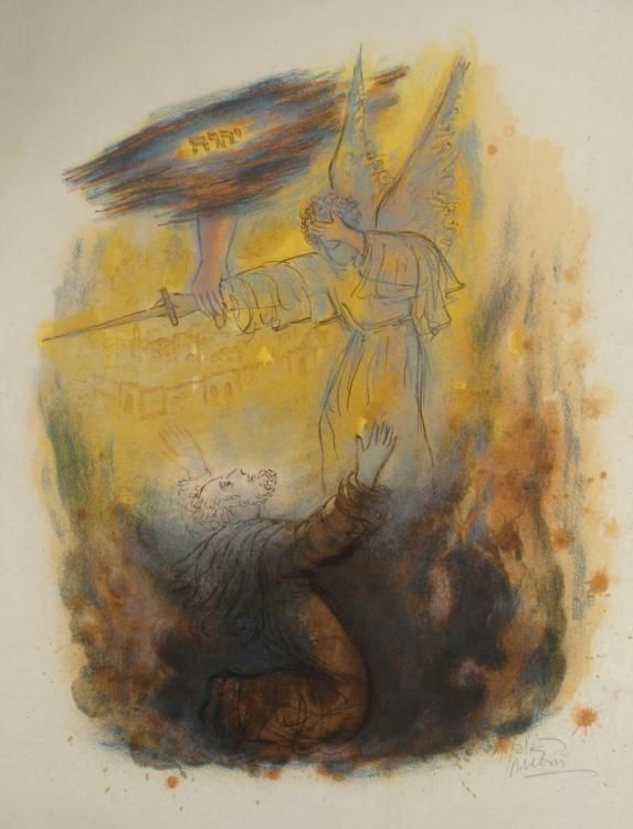 In this Biblical scene, the destroying angel is restrained at the threshing-floor of Ornan, at David's intercession. The vibrant yellows contrasting with dark colors create a dramatic atmosphere. * Artist: Reuven RubinSignature: In pencil, lower rightTitle: David Interceding with the AngelMedium: Lithograph on Japon paperEdition: ProofSize: 20 x 25 1/2 inchesCondition: ExcellentBiography: * Reuven Rubin (1893-1947) was born in Romania to a poor, Jewish Hasidic family, and later studied art there, as well as in Paris. He developed a style influenced by the work of Henri Rousseau. In Palestine, he was one of the founders of the new Eretz Yisrael style, with a folk and naive appearance. His subjects were often the biblical landscape, folklore and people. He became quite popular, despite his opposition to the modern art schools of Jerusalem. Today he is recognized as an important figure in the history of Israeli art. His work can be found in many public and private collections around the world. * *