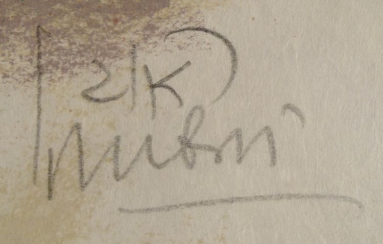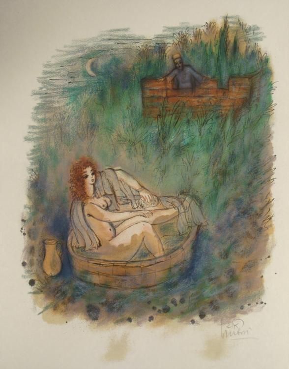 In this print, David gazes out into the evening and his vision is captivated by a beautiful woman bathing outside. The soft greens and blues create an enticing scene. Artist: Reuven Rubin Signature: In pencil, lower right Title: David & Woman BathingMedium: Lithograph on Japon paper Edition: Proof Size: 20 x 25 1/2 inches Condition: Excellent Biography: Reuven Rubin (1893-1947) was born in Romania to a poor, Jewish Hasidic family, and later studied art there, as well as in Paris. He developed a style influenced by the work of Henri Rousseau. In Palestine, he was one of the founders of the new Eretz Yisrael style, with a folk and naive appearance. His subjects were often the biblical landscape, folklore and people. He became quite popular, despite his opposition to the modern art schools of Jerusalem. Today he is recognized as an important figure in the history of Israeli art. His work can be found in many public and private collections around the world.