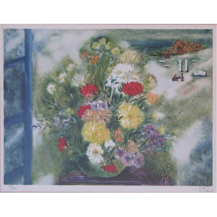 Description: A beautiful still life of Flowers set against the ancient town of Caesarea in Israel. Reuven Rubin (1893-1974) was born in Romania in 1893. He immigrated to Israel in 1912 and settled in Jerusalem. A year after he traveled to Paris to study at École des beaux-art. He then returned to Israel. Rubin's work sings with the joy of living in country sides drenched with sun, blossoming flowers, luscious fruits and in silver foliage of an age-old tree. Rubin identified with the biblical country of Israel, with its people and sunlit land. In his language of imagery he told us biblical parables in a magical and extraordinary way. Rubin is considered one of the most renowned and famous Israeli artists worldwide with works in collections of leading museums such as MoMA (New York), Museé d'art Moderne (Paris), Jewish Museum (New York) and others.