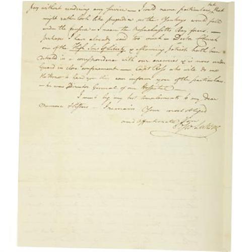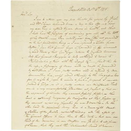 <B>[Revolutionary War] Jesse Lukens Important Content Autograph Letter Signed.</B></I> Two pages with integral address leaf, fine laid paper, 7.5" x 8.75", Prospect Hill, October 4, 1775, written to his father, "<I>John Lukens, Esqr., Market Street, Philadelphia</B></I>". Lukens writes, in full: "<I>Hon'd Sir, I am to return to you my poor thanks for yours by Dick and Mr. Clymer delivered to me a day or two ago. I hope my dear Tacy is restored to your arms in health, and that I shall have the pleasure of embracing you all ab't the 20th of this month. Our intelligence here (tho' not grounded on the best foundation, being as I am informed a letter from Boston) says that General Gage is superseded in his command by Lord Howe & that Gen'l Gage returns to England tomorrow and that General Burgoyne is fully authorized to repair to Philadelphia & treat with the Congress &c. Should this be the case, a suspension of arms will no doubt be demanded by Lord Howe, w'ch I am pretty certain will be refused by our commander here, unless ordered otherwise by the Congress - how far it might be proper to accede to such a proposal I cannot pretend to judge, as it is pretty certain our ministerial tools are in a very uncomfortable situation at present & that on the approach of Winter they cannot possibly subsist, as this Coast is extremely dangerous for navigators at that Season & they cannot expect any supplies for near 3 months. On the other hand the Nominal Army here is a down right cheat & robbers of the public, notwithstanding all the efforts of The General Officers to keep them to their duty - but near one third of the numbers in our musters are so lost to all sense of shame, that they eat the Continental Bread & receive pay without rendering any service. I could name particulars but that might rather look like prejudice as the Yankees would fall under the censure. I mean the Massachusetts Bay forces. Perhaps I have already said too much. Doctor Church, one of the High Sons of Liberty & a flaming patriot hath been defected in a correspondence with our enemies & is now under Guard in close confinement. Capt. Cross who will do me the Honor to hand you this can inform you of the particulars - he was Director General of our Hospital. I must beg my best compliments to my dear Momma & Sisters - I remain your most obliged and affectionate son...</B></I>" <BR><BR>This exceptional letter describes every important aspect of the beginning months of the Revolutionary War with details of Howe, Gage and Burgoyne. It describes the conditions of the Army and makes a quite early reference to the term "Yankees." Most importantly, <B>a fine reference to traitorous Dr. Benjamin Church: "</B></I><B><I>...Dr. Church, one of the high sons of Liberty... hath been defected in a correspondence with our enemies...</B></I></B></I><B>"</B></I> Document has some minor folds and a tear in the last page where the seal would have been, thought it does not affect the text of the document, else fine.<BR><BR><BR><b>Shipping:</b> Flat Material, Small (<a target="_blank" href="http://www.heritageauctions.com/common/shipping.php">view shipping information</a>)