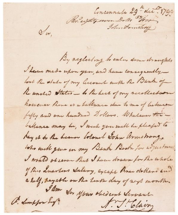 "... By neglecting to enter some draughts I have made upon you... there is a balance due to me of between fifty and one hundred Dollars... I wish you will be pleased to pay it to the bearer Colonel John Armstrong who will give in my Bank Book..."