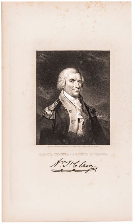 At top right, John Armstrong, Jr. Signs his receipt: "Rec'd eighty seven Dolls 58/100 - John Armstrong", also, being boldly penned and signed. Vividly Signed “A. St. Clair” at the conclusion measuring a large 2.25” long and is excellent for display. Accompanied by an Engraved Bust Portrait of the General in his military uniform by Longacre, after a painting by Charles W. Peale. A remarkable Autograph Letter Signed by both Major General Arthur St. Clair and the historic figure, Colonel John Armstrong.