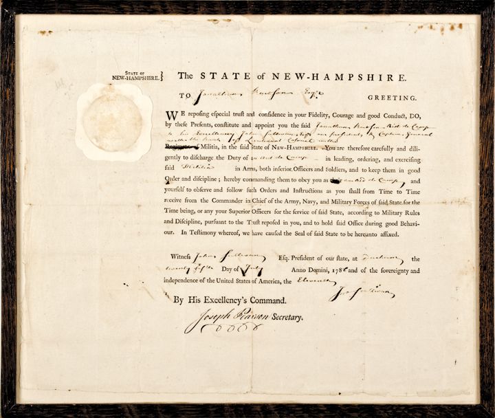 July 25, 1786-Dated, Partly-Printed Document Signed, "Jno Sullivan" as Governor of New Hampshire, 1 page, 12.5” x 15.5”, Durham (NH), with the blank areas filled out in his hand, Very Fine. This original document is appointing Jonathan Rawson as an Aid-de-Camp in the New Hampshire Militia. It has its original, intact official Seal of the State of New Hampshire. There are a few minor marginal tears and chips, with trivial pinholes at fold intersections, overall quite nice in eye appeal. The printed text is dark and clear, attractive for display, not examined out of its simple wooden frame, which measures to 14.25 x 16.5” tall. This very scarce John Sullivan Signed New Hampshire Military Commission ready for display.
