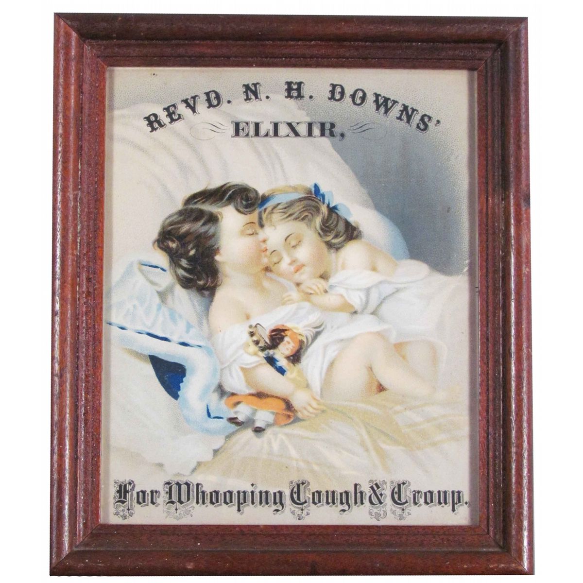 Revd. N. H. Downs' Elizer Sign for Whooping Cough & Croup. Depicting two children resting. Very good condition. Framed under glass. 6 X 7 1/2 inches.