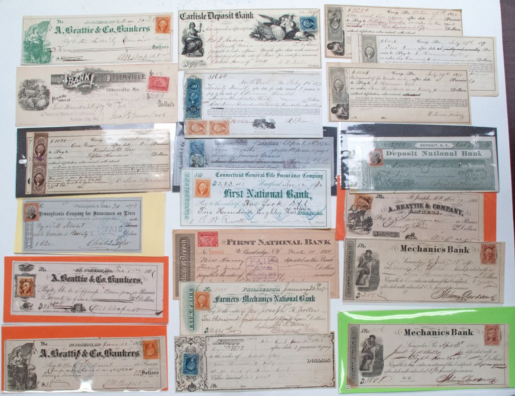 CHECKS WITH ADHESIVE REVENUES, 1864-1909, LOT OF 20: 1) A. Beattie & Co., St. Joseph, Mo., Nov.20, 1868, with 2c, Orange, Wash., US Int. Rev. Stamp. 2) Pennsylvania Company For Insurance On Lives, Philadelphia, June 24, 1873, with Orange & Black, 2c, US INt. Rev., Stamp. 3) Mechanics Bank, Lancaster, PA., July18, 1870, for Stehman Clarkson & Co., with 5c, Brown, Wash., Int. Rev., Agreement Stamp. 4) Promissory Note, Corry. Pa., Nov.17, 1870, with 2 ea. Brown 40c, US, Exchange, Stamps. 5) A. Beattie & Co., St Joseph, Mo., June12, 1869, with 2c, Orange Wash., US Int. Rev. Stamp. 6) Promissory Note, North East, Pa., Feb.10, 1872, with, 1 ea. Blue, 50c, Wash., US INt. Rev., Entry of Goods, Stamp & 2 ea. 20c, Brown, Wash.,Int. Rev., Inl. Exchange Stamps. 7) Carlisle Deposit Bank, 1864, Certificate of Deposit, with 2c. Blue, Wash., Int. Rev., Bank Check Stamp. 8) Silver Creek, Nev., Promisary Note, June11, 1867, with Blue Wash., 10c, Int. Rev. Stamp. 9) Farmers Mechanics Nat. Bank, Phillad., Jan.20, 1868, from Eli K. Price, with 2c, Orange US Int. Rev. Stamp. 10) First National Bank, Conn. Gen. First Insure. Co., Hartford, Conn., Nov.12, 1870, with 2c, Orange Int. Rev. Stamp. 11) First Nat., Certificate of Deposit, Bainbridge, NY, Mar.11, 1901, with 2c Red, US Int. Rev., Ship, Documentary, 1898 Stamp. 12) Deposit National Bank, Deposit, NY., Oct. 28, 1873, for, Ford & Perry, with Orange & Black, Wash., 2c, US Int. Rev. Stamp. 13) Mechanics Bank, Lancaster, Penn., April30, 1869, for Stehman, Clark & Son Co., with 5c, Brown Int. Rev. Wash., Certificate Stamp. 14) A. Beattie & Co., Bankers, St Joseph, Mo., Feb.3, 1867, with 2c Orange US Int. Rev., Wash., Stamp. 15) A. Beattie & Co., St Joseph, Mo., April10, 1866, with 2c US Int. Rev. Bank Check, Wash., Stamp. 16) Promissory Note, O.P. Ramsdell & Co., Buffalo, April13, 1872, with 50c, Blue & Black, US Int. Rev., Wash., Stamp. 17) Promissory Note, Corry, Pa., July27, 1870, with 1 ea. Gray Wash., 30c, US In. Exchange, Int. Rev. Stamp,& 1ea. 5c, Orange, US Int. Rev. Wash., Certificate Stamp. 18) Promissory Note, Corry, Pa., Oct.18, 1870, with Gray 30c, Wash., Int. Rev., In Exchange, Stamp. 19) Bank of Otter Ville, Mo., Sept., 1909, with 2c, Orange, Warship, 1898, US Int. Rev., Stamp. 20) Promissory Note, Corry, Pa., July, 29, 1870, with, 30c, Gray Wash., Int. Rev., In Exchange Stamp.City: County: State: