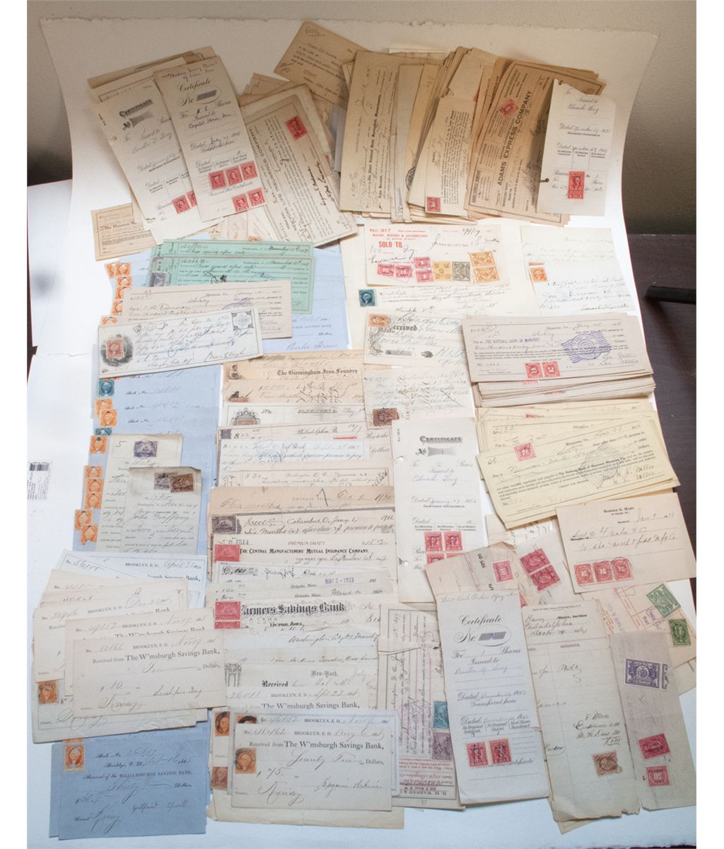 Over 100 items: Birmingham Iron Foundry, Williamsburg Savings Bank, Harold G Hart of Hartford, Adams Express Company 1916, New York & Boston Dispatch Express, National Bank of Chesapeake City, Camden Safe Deposit and Trust, and many state of New York stamps.City: WilliamsburgCounty: State: PA