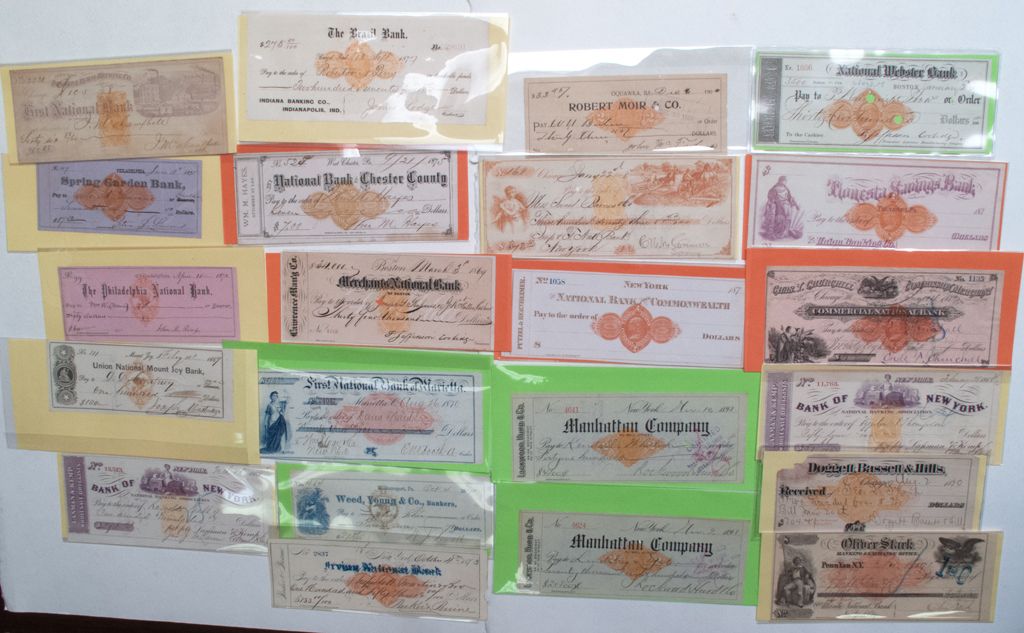 EASTERN REVENUE STAMPED COLLECTION, 1868-1900, LOT OF 23: 1) Bank Of N.Y., New York, 1869, RN-B1. 2) Unused, National Bank of the Commonwealth, 187-, RN-D1. 3) -- (can't read the first name) National Bank, N.Y., 1873, RN-D1. 4) Oliver Stark Banking & Exchange Office, Pen Yan, N.Y., 1871, RN-C13. 5) Commercial National Bank, Chicago, Ill., 1875,RN-D1. 6) First National Bank Of Marietta, 1870, RN-C1. 7) Merchants National Bank, Boston, 1869,RN-B1. 8) First National Bank of Chicago, 1868, RN-B1. 9) Union National Mount Joy Bank, Mount Joy, 1869, RN-H3. 10) National Bank of Chester County, West Chester, Pa., 1875,RN-D1. 11) The Philad. National Bank, Philadelphia, 1872,RN-H3. 12) Weed Young & Co. Bankers, Williamsport, Pa., 1871,RN-H3. 13) Unused, Farmers Bank, Liverpool, Pa., 187-,RN-K6. 14) Unused, Tionesta Savings Bank, Tionesta, Pa., 187-,RN-D1. 15) National Webster Bank, Boston, 1874,RN-D1. 16) Manhattan Co., New York, 1898,RN-X7. 17) Daggett Bassett & Hills, Chicago, 1870, "note" this check has a piece missing on the upper l/h edge, and some soiling, RN-C16. 8) The Brazil Bank, Brazil, Ind., 1877,RN-D1. 19) Spring Garden Bank, Phil., 1875,RN-D1. 20) Manhattan Company, N.Y., 1898,RN-X7. 21) C.H.Mc.Cormick & Bros., Chicago, 1868,RN-B1. 22) Robert Moir & Co., Oquawka, Ill., 1900,RN-X7. 23) Bank Of New York, N.Y., 1868, RN-B1.City: County: State: