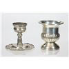 The urn-form cup (2 1/2in. tall) is engraved with Greek letters, and marked on base: "Revere Silversmiths/Inc/[horse in shield]/Sterling/Reinforced/With Cement/849." Together with two silver-plated crowns (one with stand), a silver petal-form dish, two cloisonne petal-form dishes, and a costume jewelry locket.
