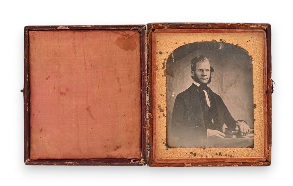From the John Coffee Hays, Applewhite-Clark Collection. Daguerreotype: Circa 1849 image of Rev. Doctor J.M Anderson, a Presbyterian pastor with Bible. , Rev Anderson performed the wedding ceremony for John and Susan Hays at The Magnolia Hotel in Seguin, Texas in 1847, then owned by Susan's cousin. 1/6 plate. Early casing. Early frame w/surround 2.75" x 3.25"