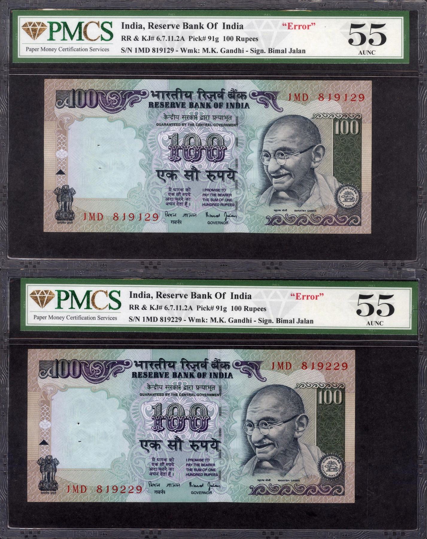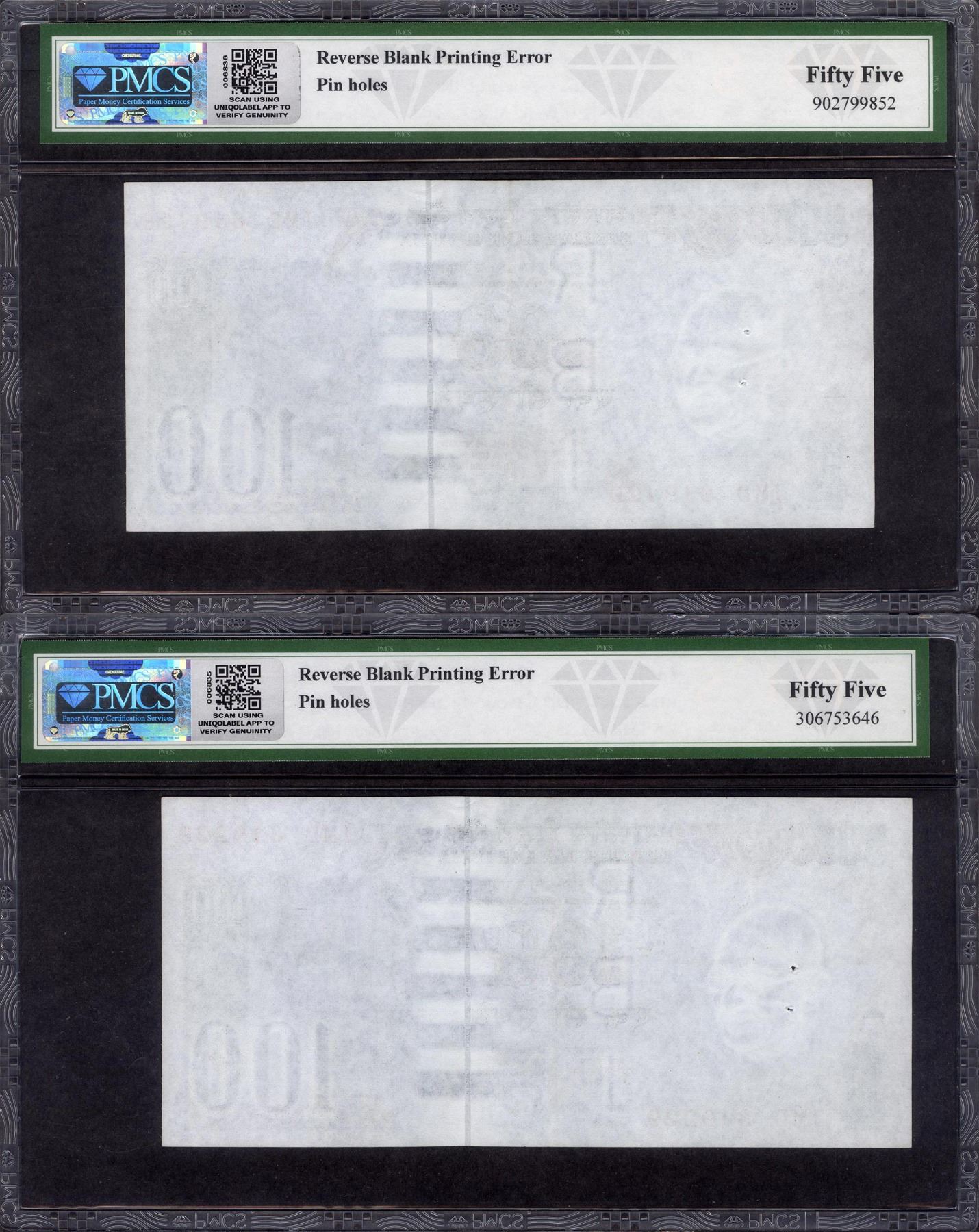 Republic India, Error 100 Rupees (2),Running Pair, Signed byBimal Jalan, Error:Reverse blank or uniface error,complete printing missingat reverse leaving it like uniface,S. No. 1MD 819129 819229,pinholes,graded by PMCS as 55AUNC, Very Rare.