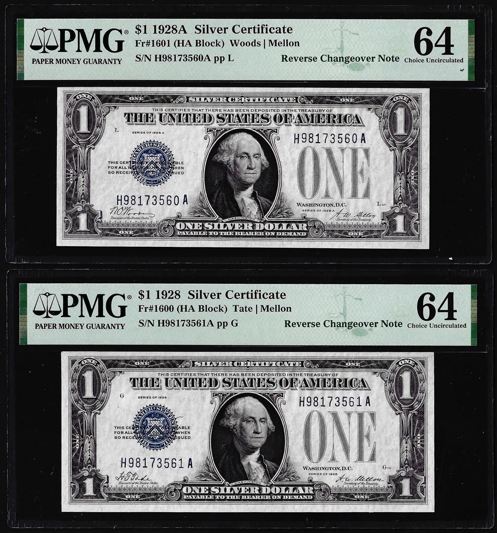 One Reverse Changeover Pair 1928A/1928 $1 Silver Certificate Notes PMG Ch. Uncirculated 64. PMG Certified.