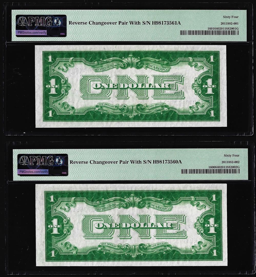 One Reverse Changeover Pair 1928A/1928 $1 Silver Certificate Notes PMG Ch. Uncirculated 64. PMG Certified.