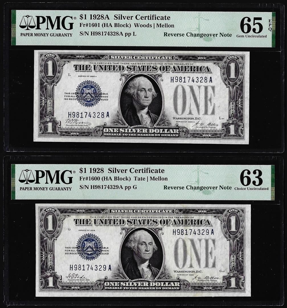 One Reverse Changeover Pair 1928A/1928 $1 Silver Certificate Notes PMG Uncirculated 65/63EPQ. PMG Certified.