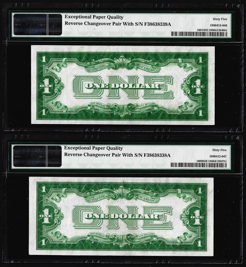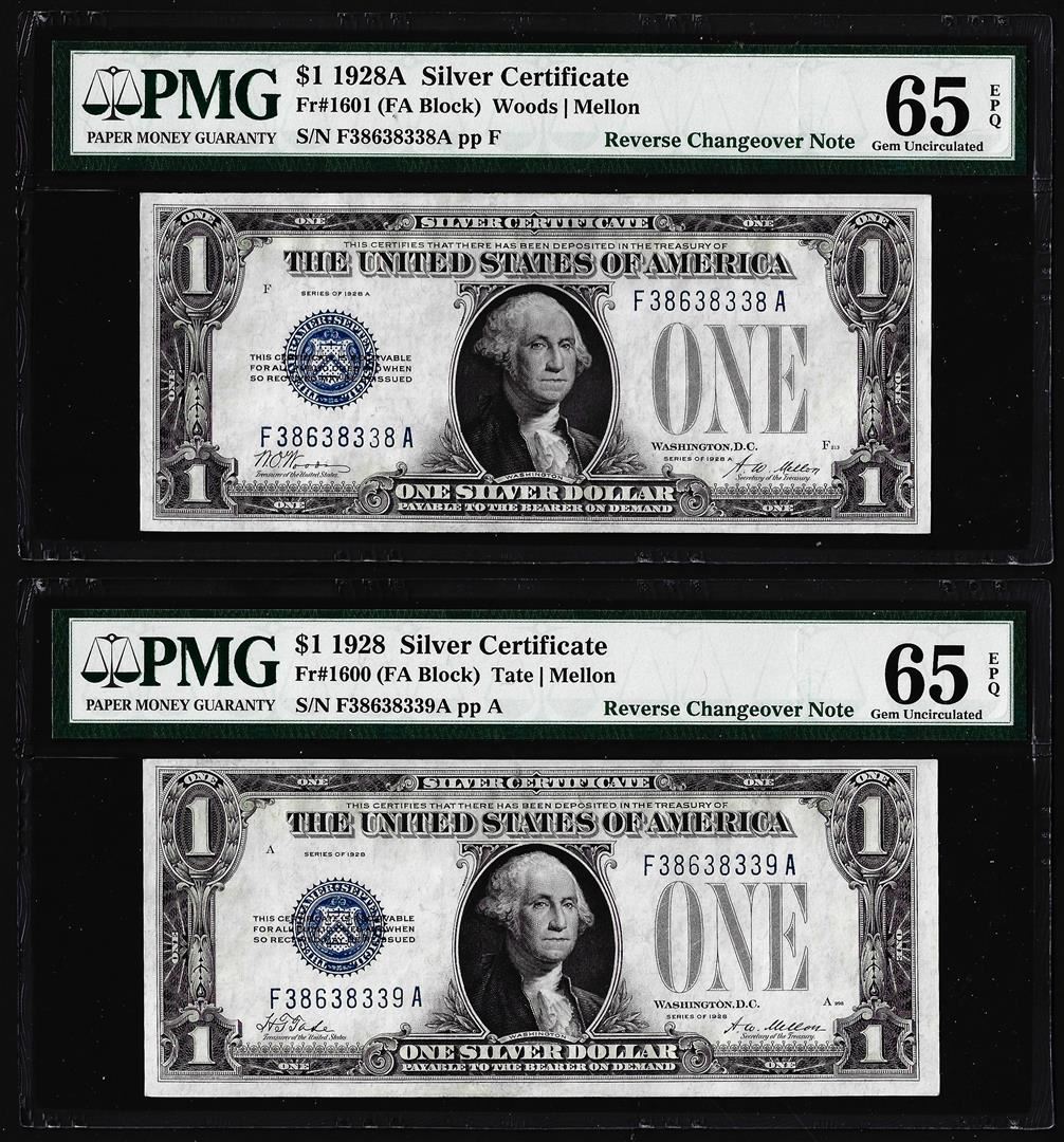 One Reverse Changeover Pair of 1928A/1928 $1 Silver Certificate Notes PMG Gem Uncirculated 65EPQ. PMG Certified.