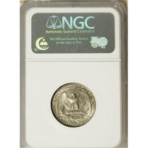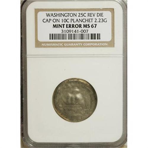 <B>Undated Washington Quarter--Reverse Die Cap on a Dime Planchet--MS67 NGC.</B></I> 2.23 gm, very close to the 2.27 gm standard weight of a clad dime. The reverse is well struck, although UNITED and QUARTER have the stretched appearance typical of peripheral legends on wrong planchet errors. The reverse rim is of irregular height, perhaps 4 mm near 10 o'clock and nearly absent opposite near 4 o'clock. The obverse is featureless aside from a faint image of the reverse, allowed by the thin flan.<BR><BR><B>Coin Engraver:</B> John Flanagan<BR><BR><b>Shipping:</b> Coins & Currency (<a target="_blank" href="http://www.heritageauctions.com/common/shipping.php">view shipping information</a>)