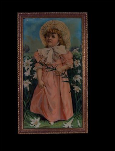 Reverse Glass Framed Picture Young Girl w/ Bonnet and Morning Glories