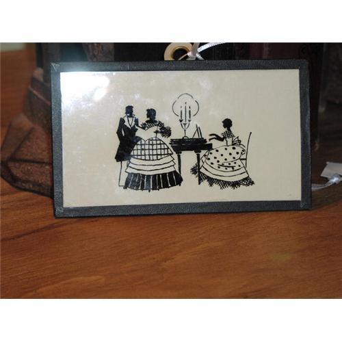 This is a charming little piece of reverse glass painted silhouette. It is in excellent condition. It bound in black tape like material and has a built in hanging mechanism. The subject is just precious and the quality superb. Would make a wonderful addition to a silhouette collection or in a decorative tabletop grouping. Please email with any questions.
