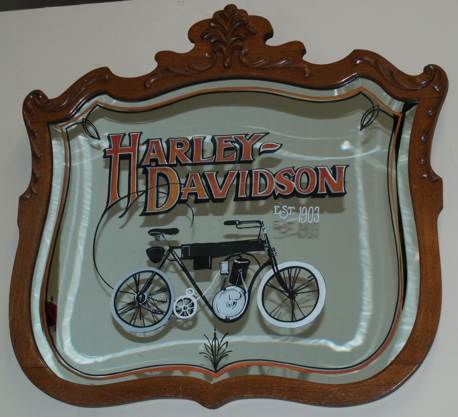 Reverse Painted Beveled Mirror in Fancy Oak Frame Hand Painted Scene from An Early Harley Davidson Motorcycle Advertisement