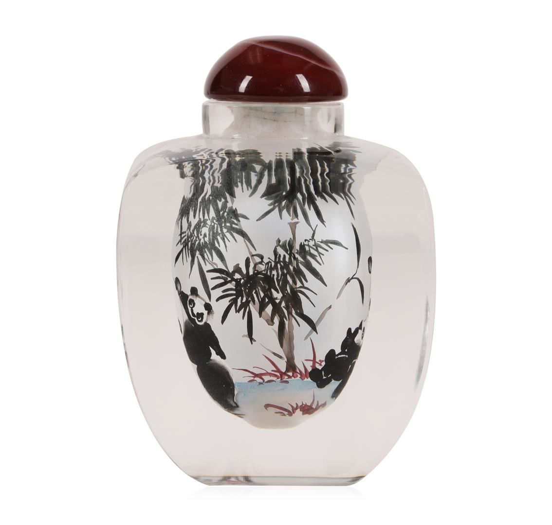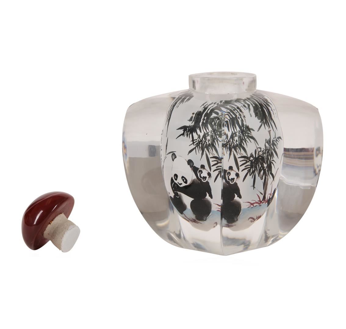 Vintage pre-owned condition. No chips or cracks. No box. A gorgeous snuff / perfume bottle that's reverse painted. Hand painted inside in meticulous detail are panda bears and bamboo trees and foliage. Artist signed. The bottle measures approximately three and a half inches tall.