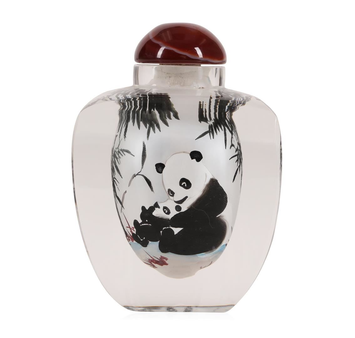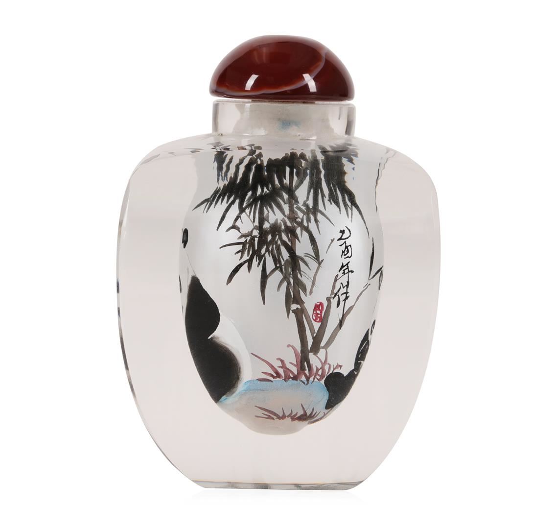 Vintage pre-owned condition. No chips or cracks. No box. A gorgeous snuff / perfume bottle that's reverse painted. Hand painted inside in meticulous detail are panda bears and bamboo trees and foliage. Artist signed. The bottle measures approximately three and a half inches tall.
